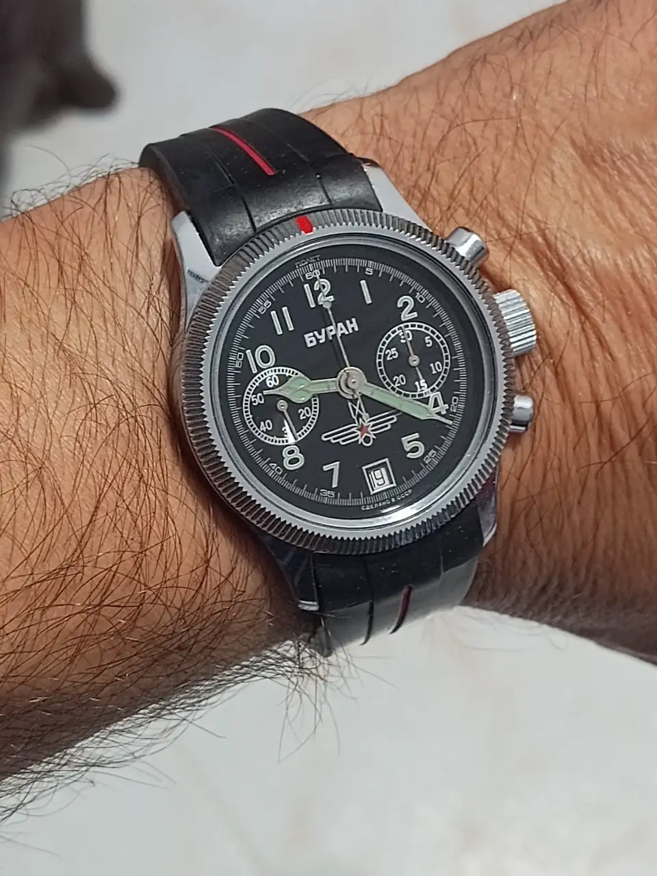 Voy con mi Buran al que le cambié la correa mientras me llega la bund. Le puse un caucho (no me hacen tilín) pero curiosamente se ajusta como un guante y no le queda ni tan mal, como lo veis?..