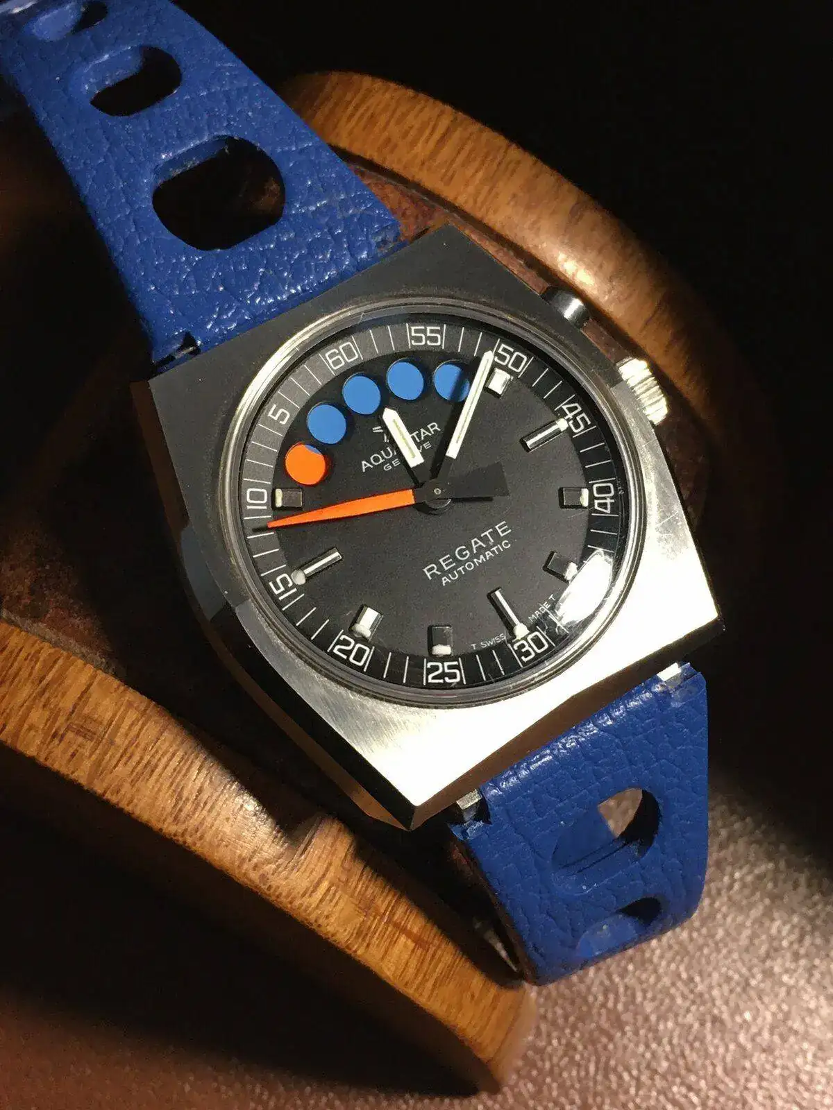 Gracias Miguel. Hablando de relojes en los que el paso del tiempo es una delicia, el Regata que muestras hoy debe ser realmente bonito en movimiento con ese juego de círculos azules y naranjas, sumado a la trotadora.Que bonito ¡¡ y que bien le queda a este reloj las marcas del paso del tiempo, luce como un fosil¡¡