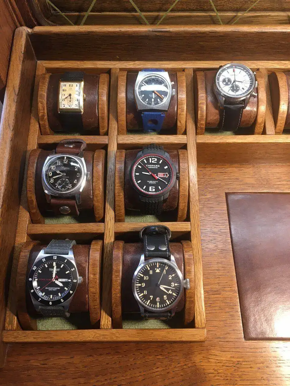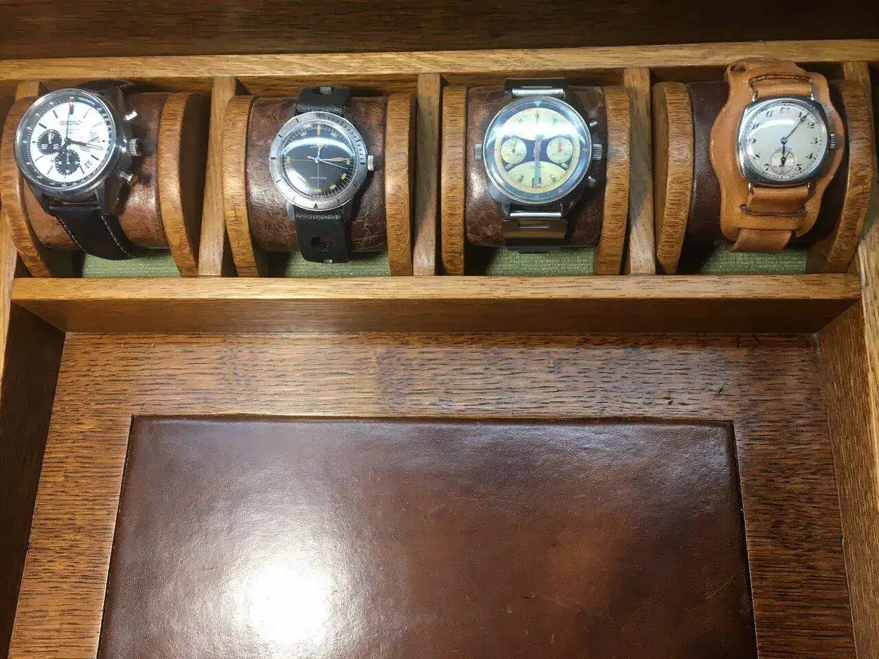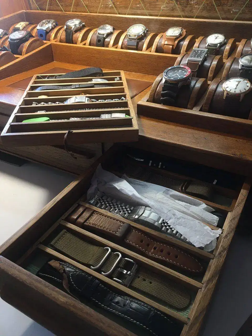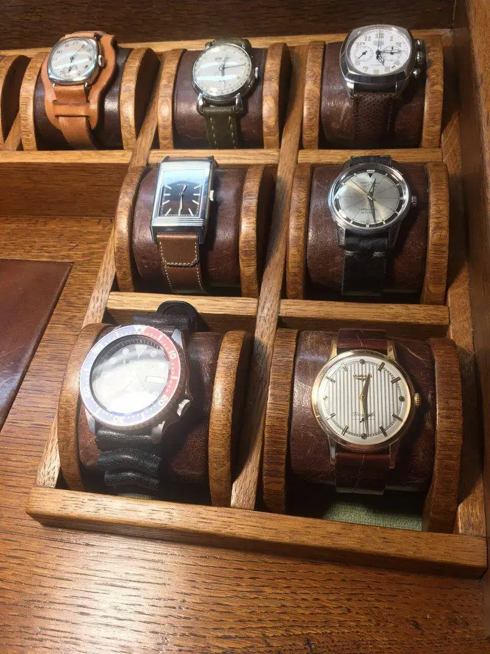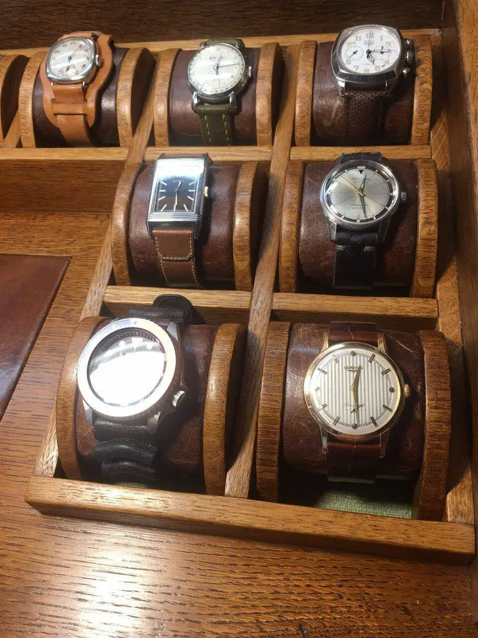 Está hecha con unos retales de roble muy bueno que no podía desperdiciar, caben 24 relojes y hay 6 bandejas para correas / armis , otro cajón para utensilios y departamento para 8 relojes guardados detrás con sus almohadillas también, por eso de complicarme la vida y aprovechar el espacio, luz incorporada.
