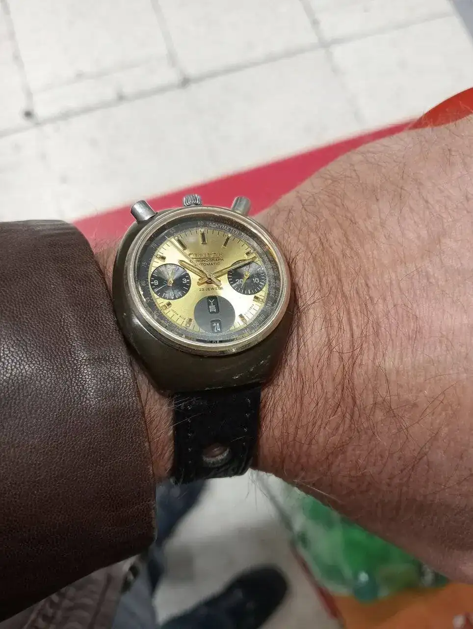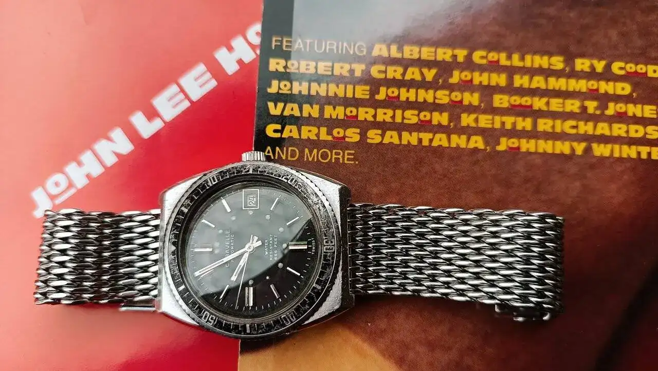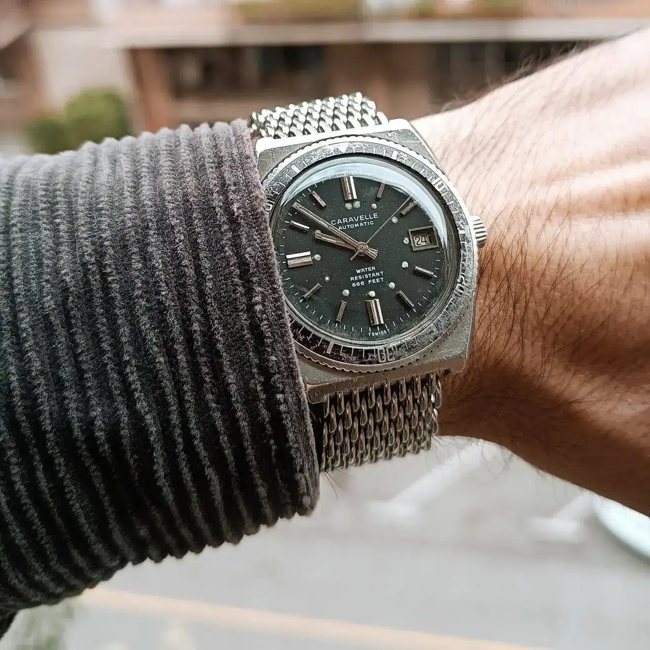 Pues sí Miguel, si lo miras a plena luz y sin el brillo del plexi, es un negro verdoso (me recuerda a la pizarra). Por las que habrá pasado el pobre en estos 54 años, para quedarse así... Y gracias, la malla la tenía puesta en un retro-moderno con el que voy a la playa, tiene dos veranos ya y tiene suficientes marcas para no desentonar con este reloj. Se la acabo de cambiar por la correa de cuero que tenía puesta y a mí me encanta la nueva combinación.Alucino¡¡ y en la segunda foto tira a verde