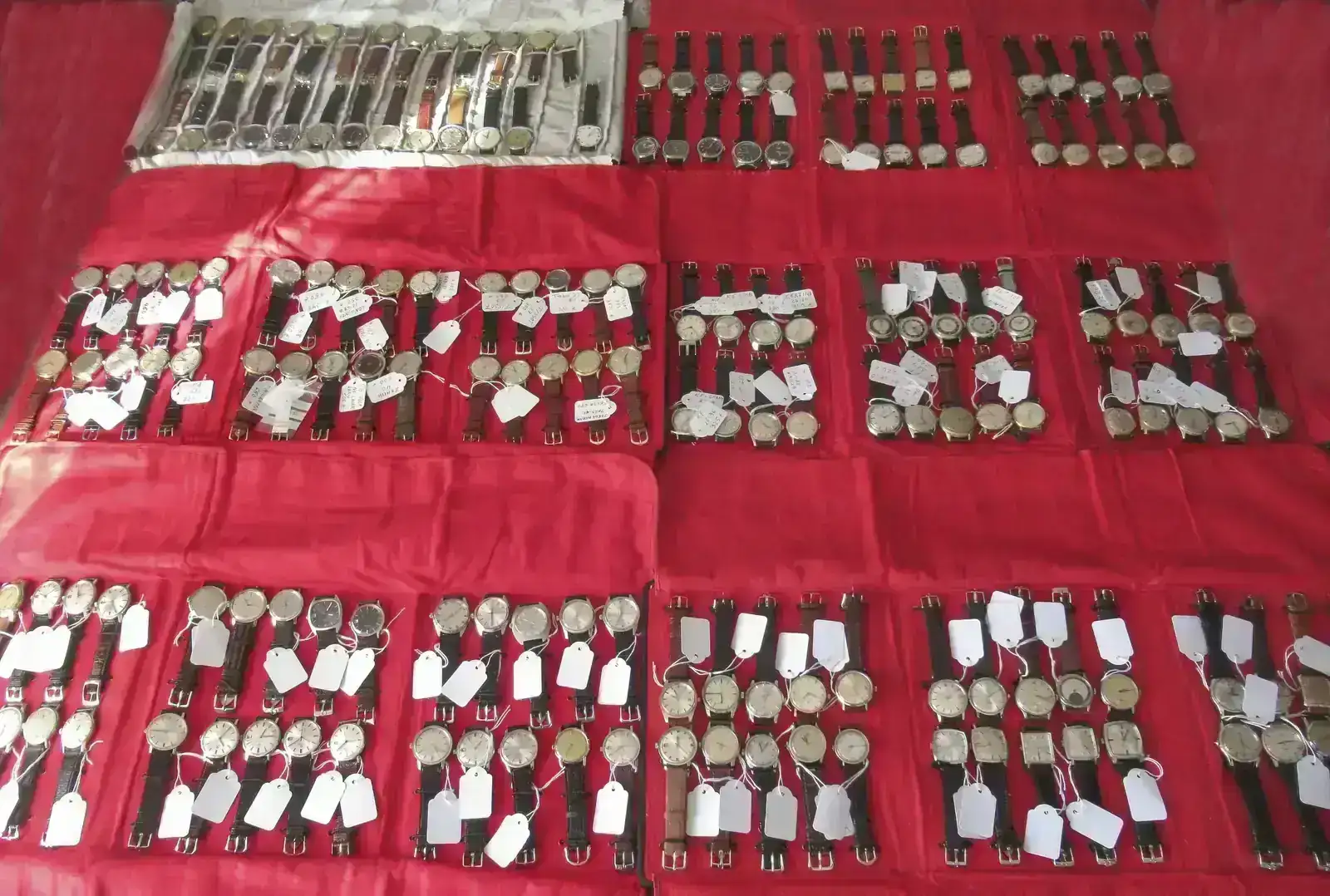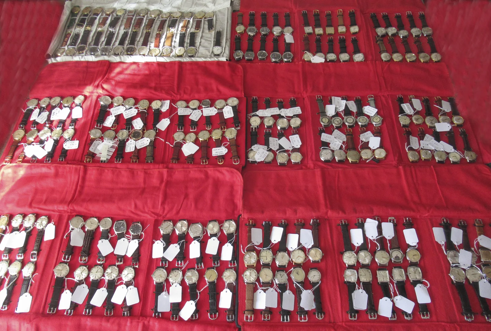 J****r, cómo os las gastáis en Sevilla. Así está el mercado de vintages, desabastecido.Con lo habilidoso que es mi paisano Vicente haciendo estanterías y mobiliario contenedor de relojes me extrañó verle ayer esos montones desordenados, así que hoy voy a ver si le inculco el uso de mantas reloreras, esas que usaban los antiguos "viajantes de joyeria", que tampoco hace tanto.