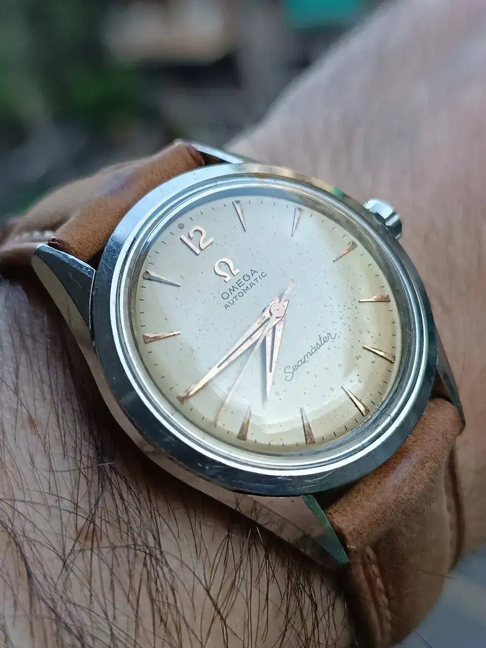 Babeo, babeo, babeoooooooMilspec tropical y tropicalizando… que bien sintonizan el marrón de la esfera, con la Patina del Material luminiscente tanto en esfera como en el insert del bisel, y incluso la patina del disco indicador de humedad, tan hipnótico. Hasta con la correa.