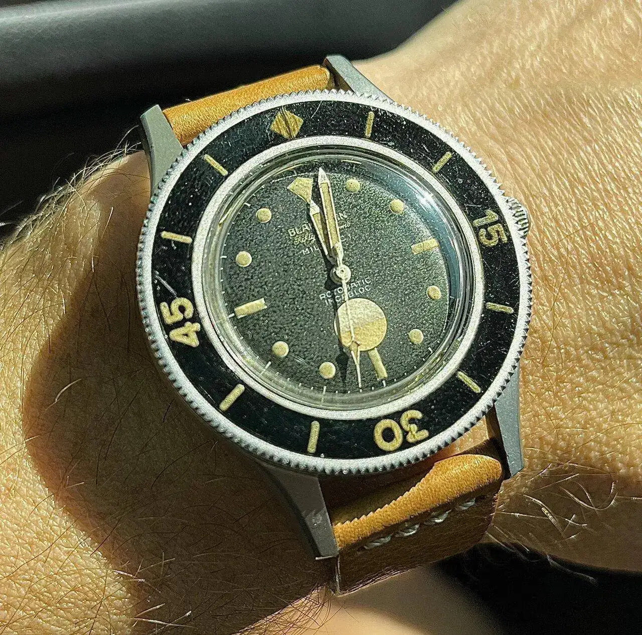 Milspec tropical y tropicalizando… que bien sintonizan el marrón de la esfera, con la Patina del Material luminiscente tanto en esfera como en el insert del bisel, y incluso la patina del disco indicador de humedad, tan hipnótico. Hasta con la correa.