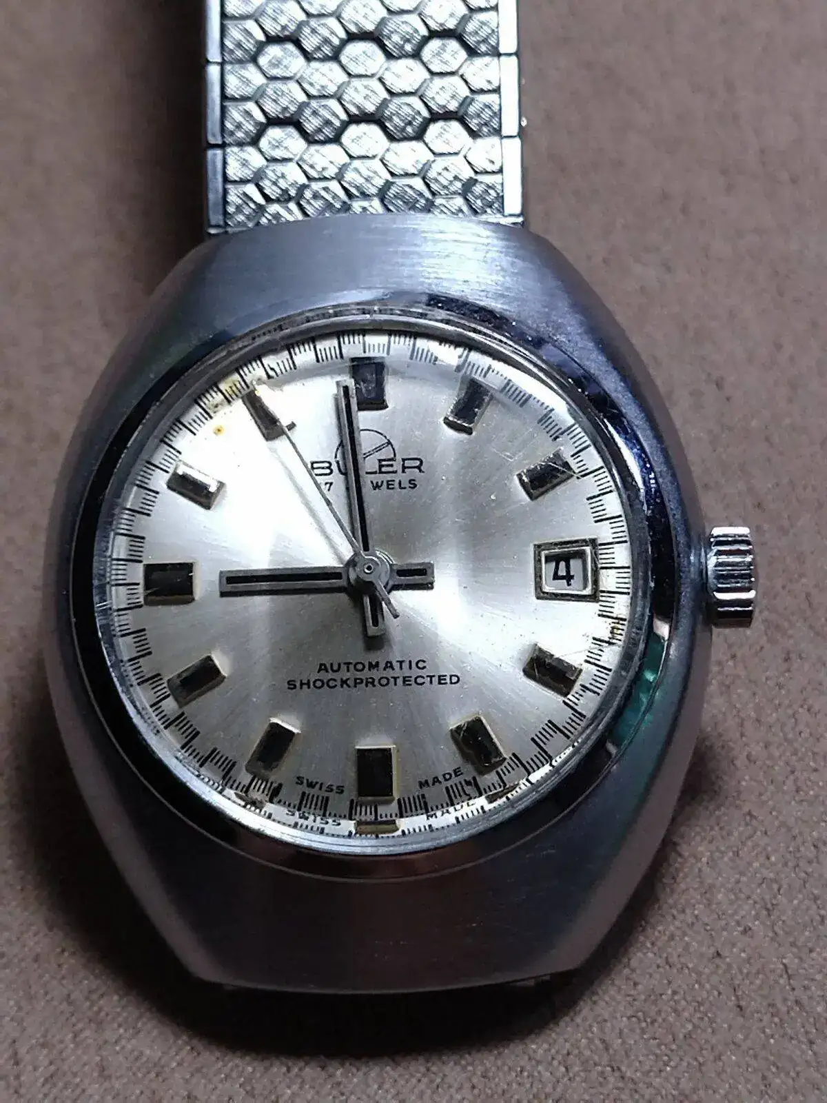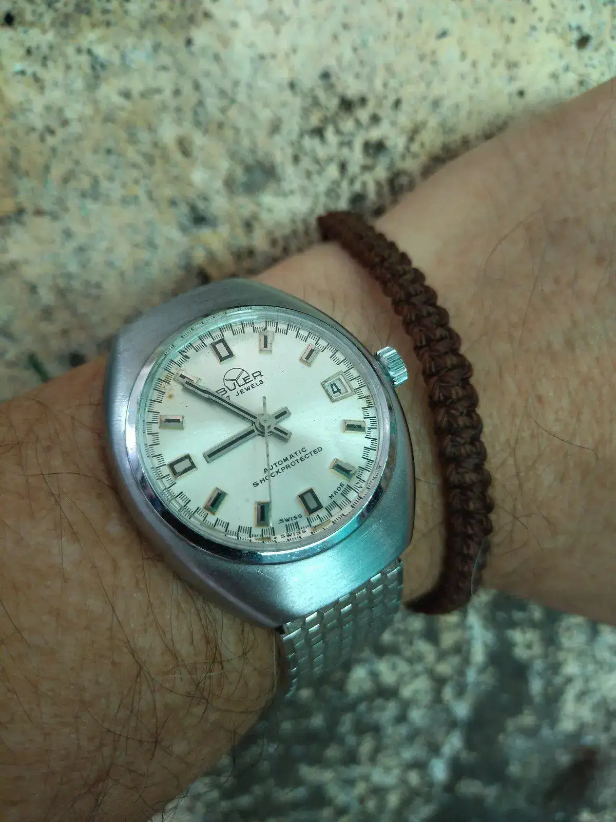 Yo, sigo en mi muy particular "Semana del reloj Clásico", hoy tocó el turno de este Buler automatico, 13083C, con su bonita caja tipo "barril" y para acompañarlo, le he calzado un bonito brazalete Speidel con un particular diseño, (tambien tengo debilidad por los brazaletes de epoca y tengo un pequeño "rejunte", que no coleccion).