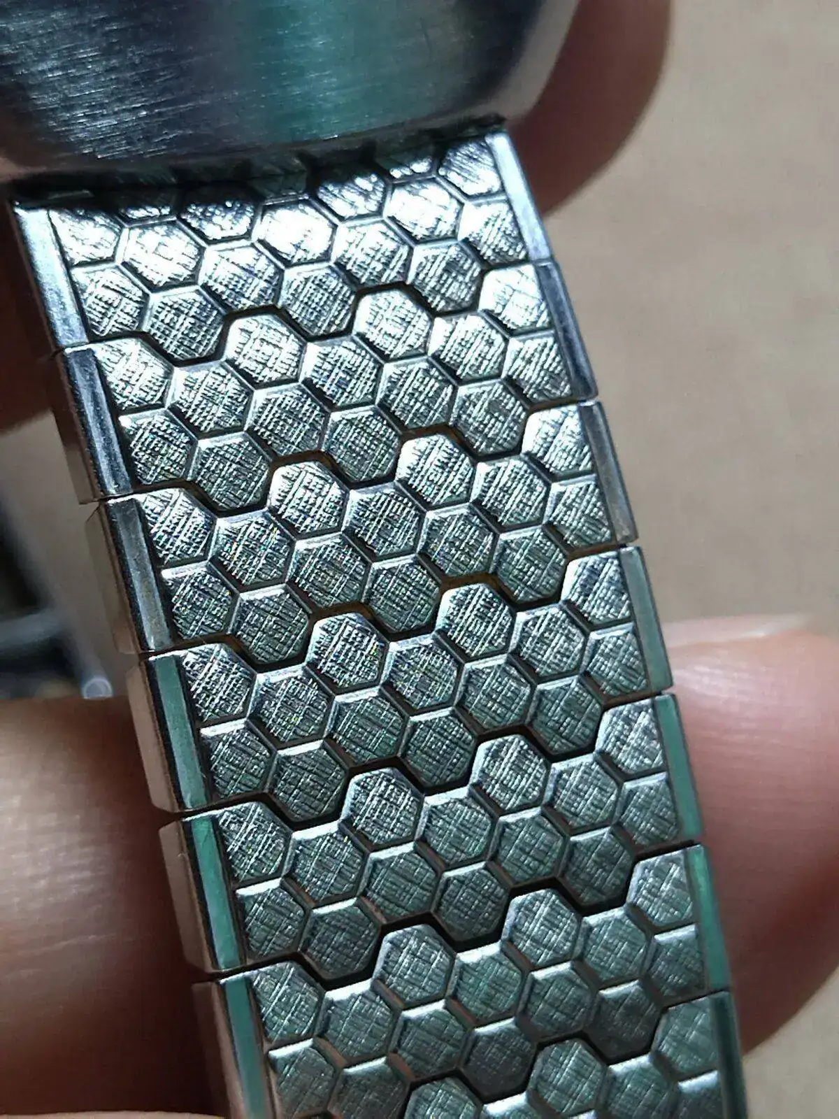 Detalle del brazalete y su curioso patron de panal de abeja.