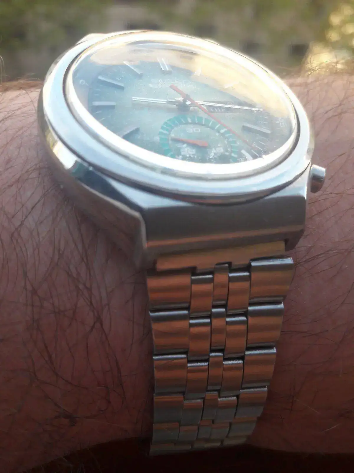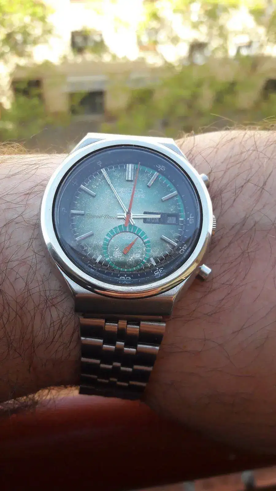 Buenas tardes distinguida concurrencia vintagera. Hoy voy tarde para mi lapidación diaria. Hoy volvemos a los cronos samuráis setenteros con uno bien raro de ver por estos lares. La esfera está bien ajada pero conserva todas sus grafías y un bello color que una vez fue más radiante. Os hablo de un Seiko 6139-7060 apodado green eye o big eye. Espero guste al respetable.