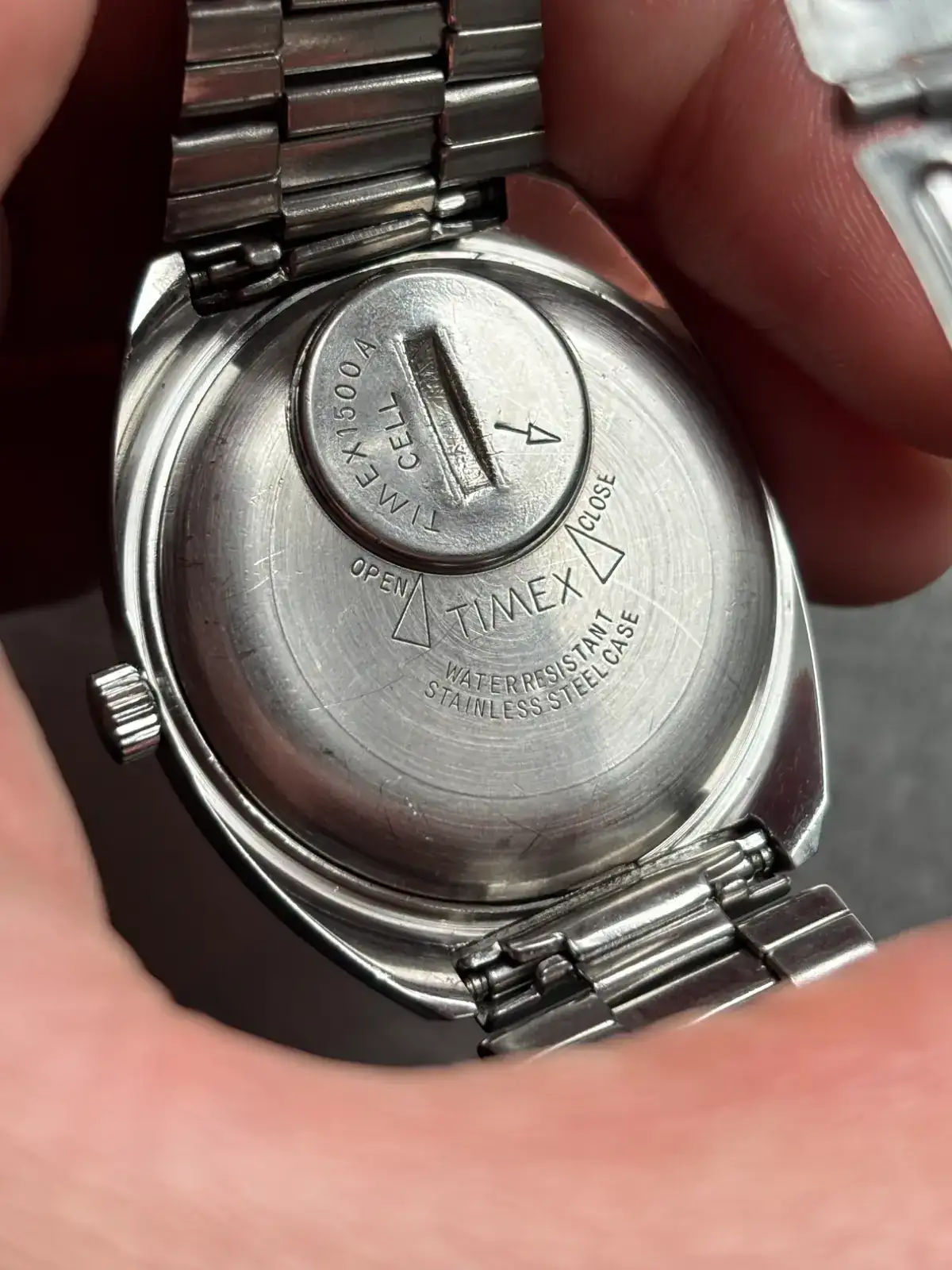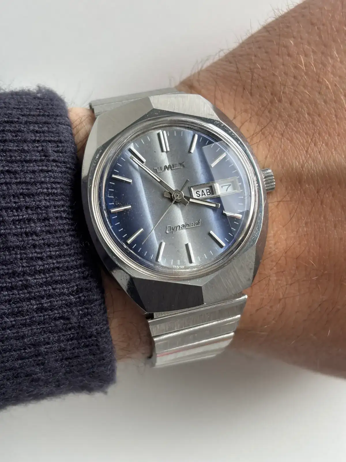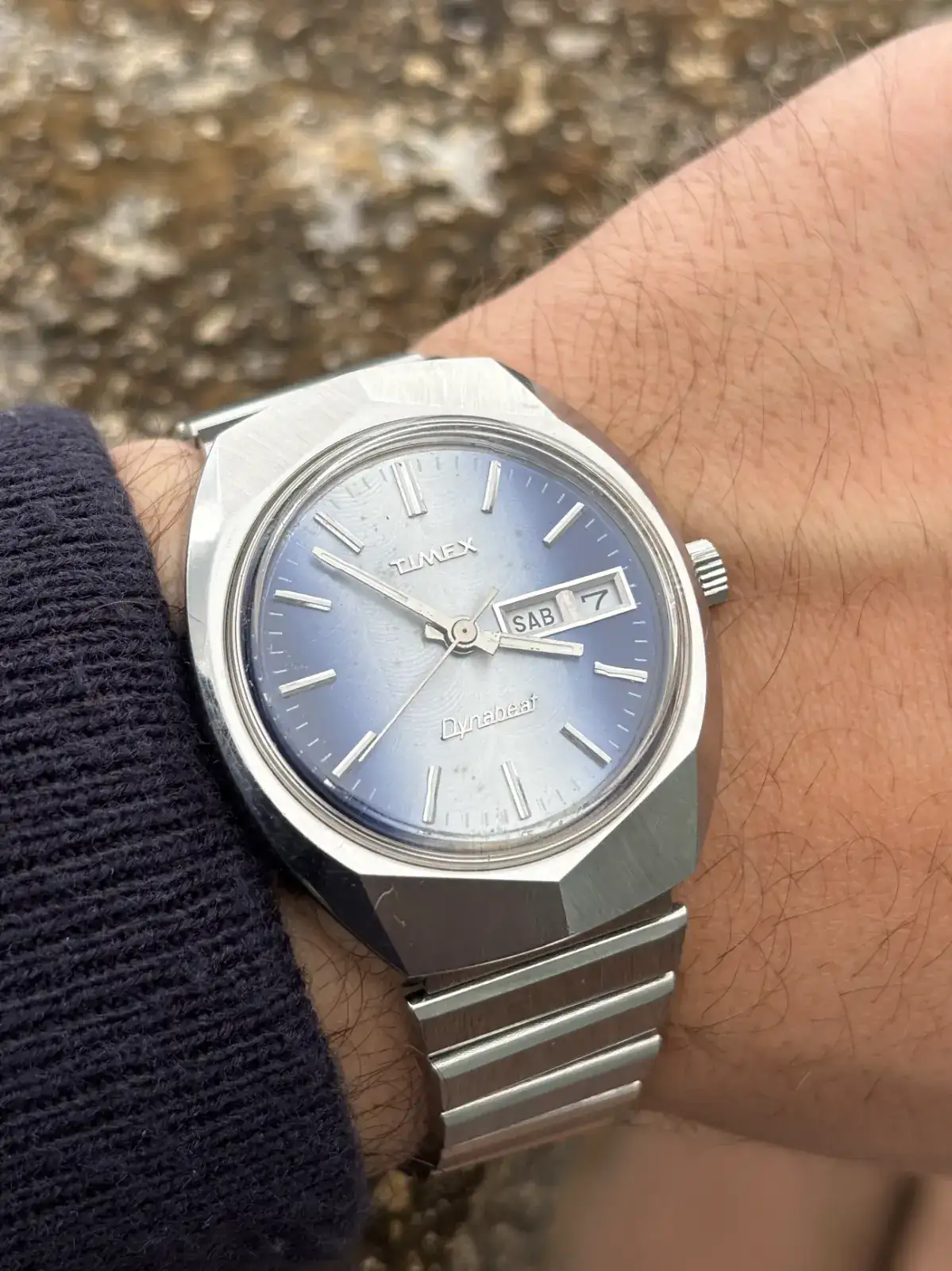 Que diseño tan bonito tiene ese Timex!, esfera, caja... menuda triunfada de caza!.Con la otra pesca del Rastro. Tras adecentado (sin poder quitar suciedad del dial porque como intente acceder...se rompe el reloj seguro) y contra todo pronóstico funcionando, con un poco visto Timex Dynabeat electromecánico. Acero Honkongnes. Saludos a todos.