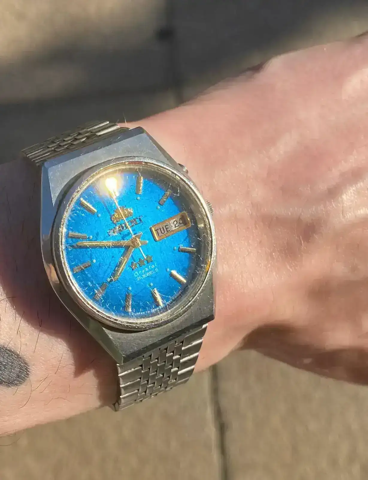 Encontré este reloj de mi padre en un cajón y lo he reparado. Me encanta el tono de azul que tiene. En principio, había dejado el cristal tal cuál el lo tenía, por los intangibles de llevar el reloj como lo llevaba él, pero es cierto que hace que no se vea tan espectacular el azul y dificulta un poco la legibilidad en mi opinión. Con lo cual, creo acabaré cambiándolo / puliéndolo ¿Cómo lo veis?