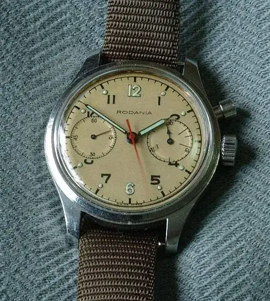 Se trata del modelo de la marca Rodania, el 4449 H ( es bastante facil encontrar referencias de este modelo en internet) lleva un venus 175, esta marca está relacionada con la marca Cándino, también estos modelos los fabricó la marca Breiltling ( con Valjoux 23 6) y otras dos marcas conocidas de las que ahora mismo no recuerdo su nombre.