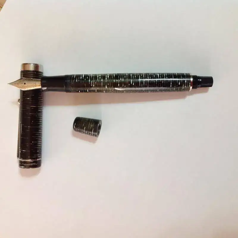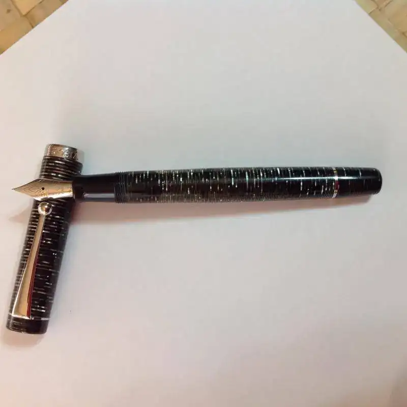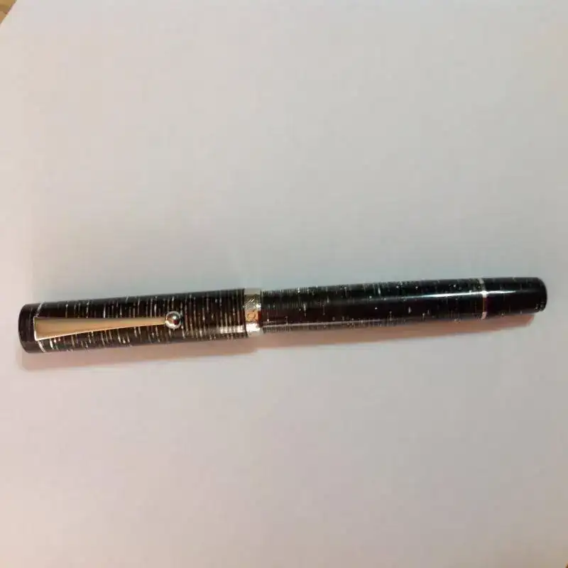 Recurro una vez más a vuestra contrastada sabiduría para identificar y conseguir bibliografía de esta Visconti que ha llegado a mis manos. Es de celuloide "striped" , carga por émbolo (en realidad convertidor cautivo a la italiana), plumín 18 k a la antigua usanza de la marca y grabado en el anillo del capuchón "Visconti 74"..
