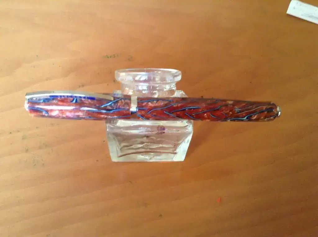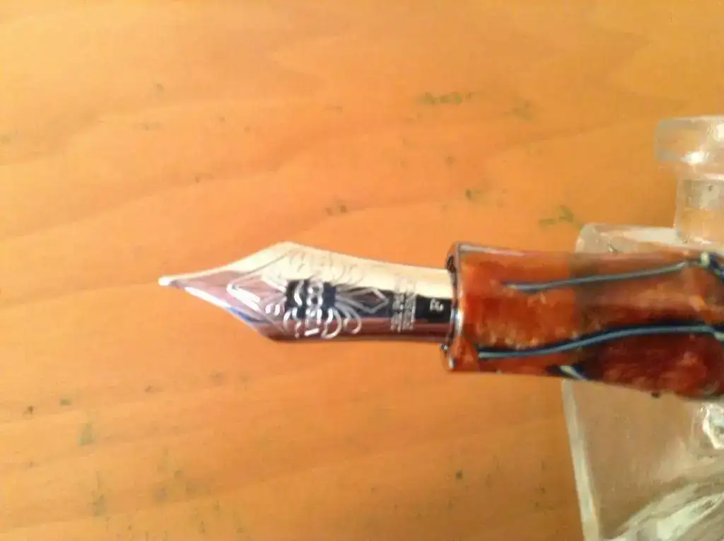 Es de un precioso celuloide, único, que no se usa en ningún otro modelo. Tiene plumin Dreamtouch de paladio 23 k, punto F, que escribe de maravilla.