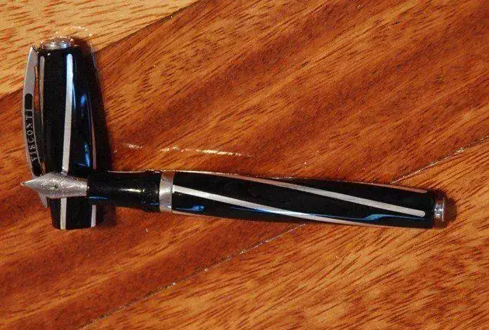 Es una pluma que aunque muy dura, acusa el paso del tiempo y de unos años jóvenes en los que fue tratada sin el más mínimo cuidado, pero a pesar de todo ahí sigue, así que vamos a darle una segunda juventud, de momento ya le he pedido un conversor de cartucho. Plumín F bastante duro.La otra que os muestro es la última en llegar, una Visconti Divina Medium Size, que me he regalado por mi cumpleaños. Iba buscando otra cosa pero después de ver este modelo me gustó mucho. Plumín M generoso diría yo desde mi corta experiencia. Me gusta bastante el sistema de cierre por bayoneta con el que tenía algunas dudas.