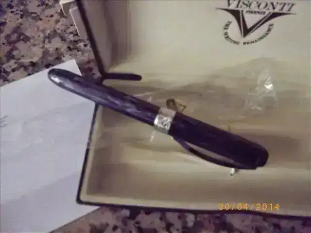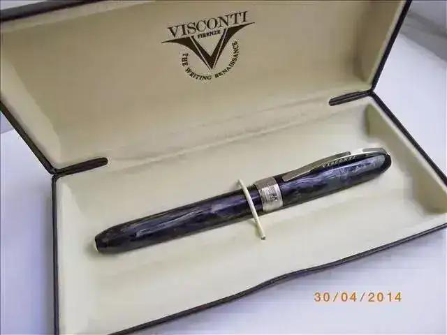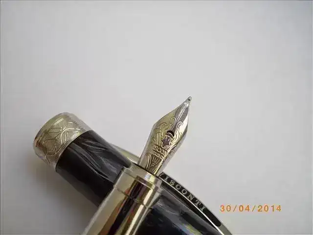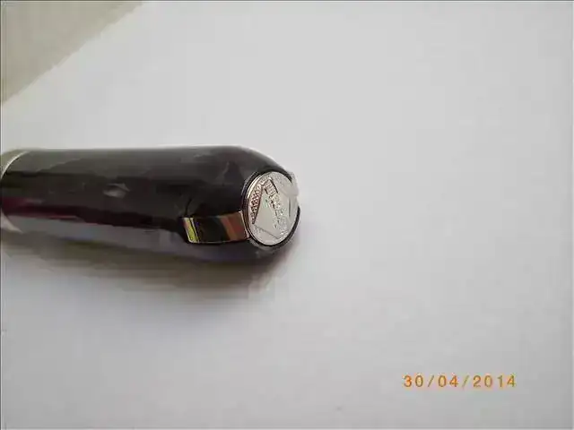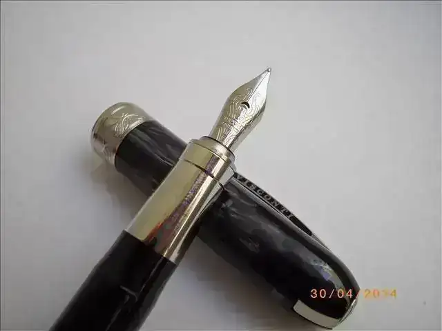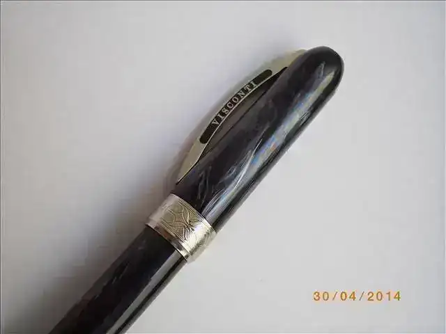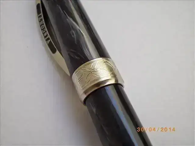 El material de la pluma parece ser un celuloide veteado en grises y negro que te obliga a mirarlo y mirarlo sin que seas capaz de hurtarle la mirada, es ciertamente hipnótico.