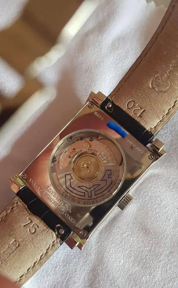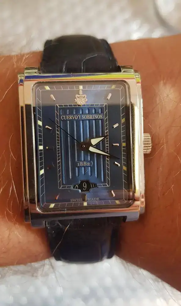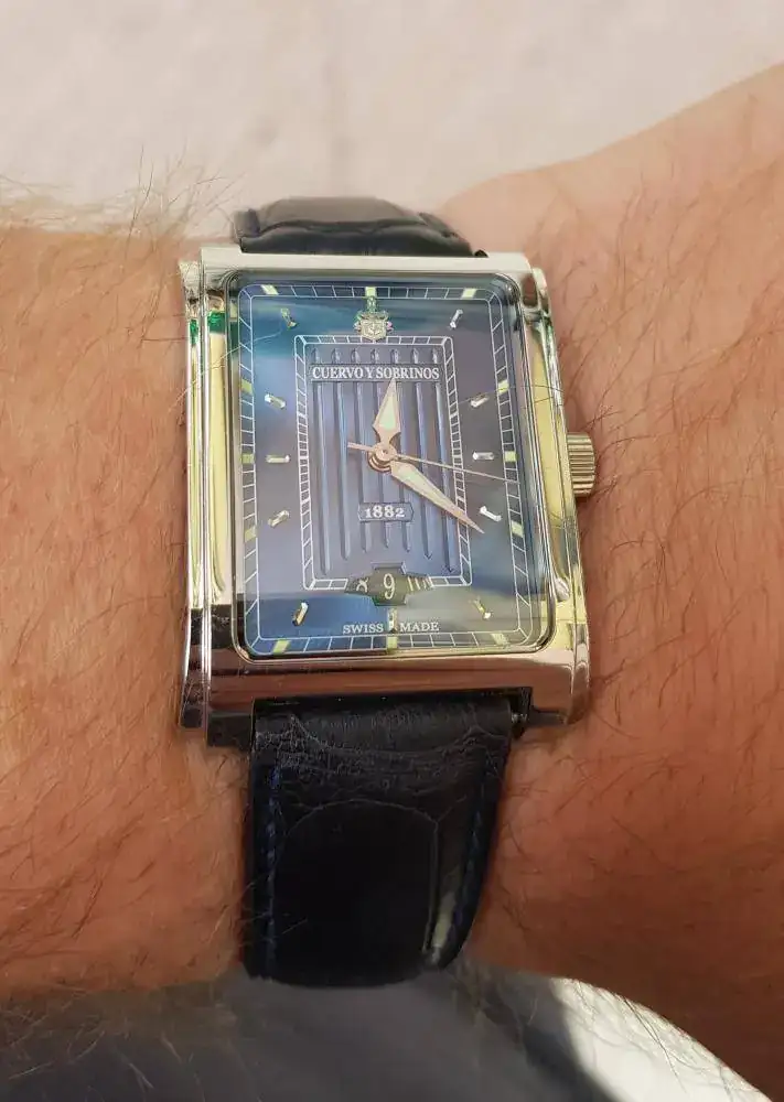 Esta novedad muy reciente, también "caprichito" y BBB. Tenia ganas, desde hace tiempo, de algún reloj de corte clásico, de vestir, a poder ser rectangular o cuadrado, Pero que siguiese esa "particularidad" con la que tanto me identifico y acabe "tropezandome" el CyS. Tiene una bonita y parece que trabajara caja, en 2 planos, y con curva tanto frontal, como lateral. El dial tiene curioso tono azul, con unas hendiduras centrales que recuerdan (o al menos a mi) a la cajas en las que los mayores llevaban los puros, y que en segun incida la luz tiene destellos verdosos, como también los tiene el extraño fechador. Las bonitas agujas tiene lumen, así como los laterales del dial que coinciden longitudinalmente con los indices horarios plateados aplicados que durante el día generan reflejos muy interesantes.