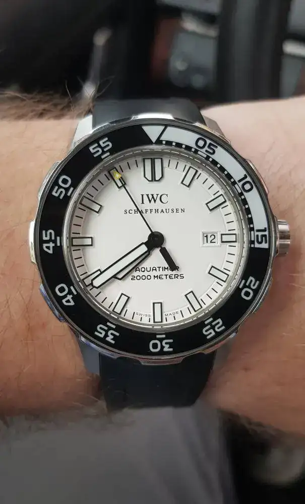 Ya tiene apodo "el gran blanco" 44mm que visten más pequeños por las asas, con ese magnífico bisel de zafiro full lumen, un dial blanco roto precioso, y, en conjunto, un reloj herramienta con un toque refinado como suele ser habitual en IWC, que lo convierten en un imprescindible.
