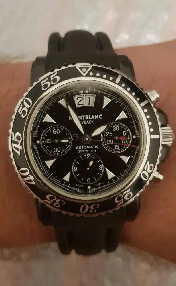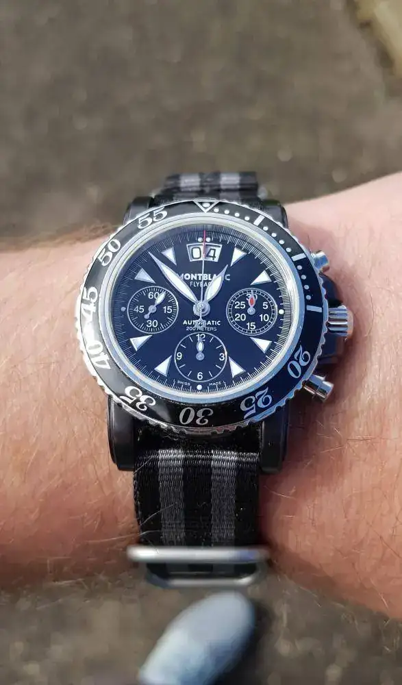 Un muy bonito crono, con un aire formal pero que con su Valjoux7750 invertida modificada por Montblanc, función flyback, big date, 200m WR, y bisel unidireccional, lo convierten en un perfecto reloj de Sport (mientras el negro Dlc aguante). Que fue mi primera compra en Wallapop y una experiencia bastante más buena de lo que me esperaba (a veces tantos prejuicios es lo que traen, a saber cuántas más joyitas se me habrán escapado)