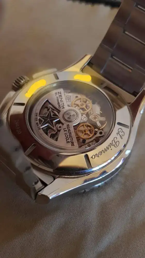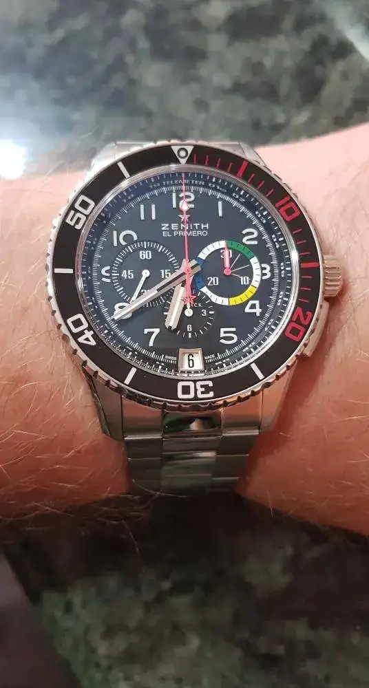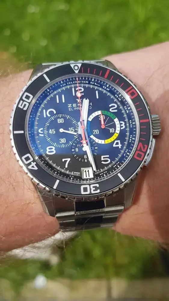 El reloj es una "mastodontica" (oficialmente lo anuncian como un 45mm pero yo he medido 46'2mm) reedición del Rainbow (40mm) multicolor que Zenith sacó en el 97 supuestamente para la Aviación Francesa y que por temas de presupuesto no llegó a cerrarse la entrega...y que se ha convertido en un icono de coleccionistas de la marca. Sin embargo, la ergonomía de su caja y su poca altura, más el efecto bisagra del brazalete, hace que se vista bien incluso en muñecas medias. El bisel, de aluminio, mantiene ese toque vintage aderezado con el famoso rojo.