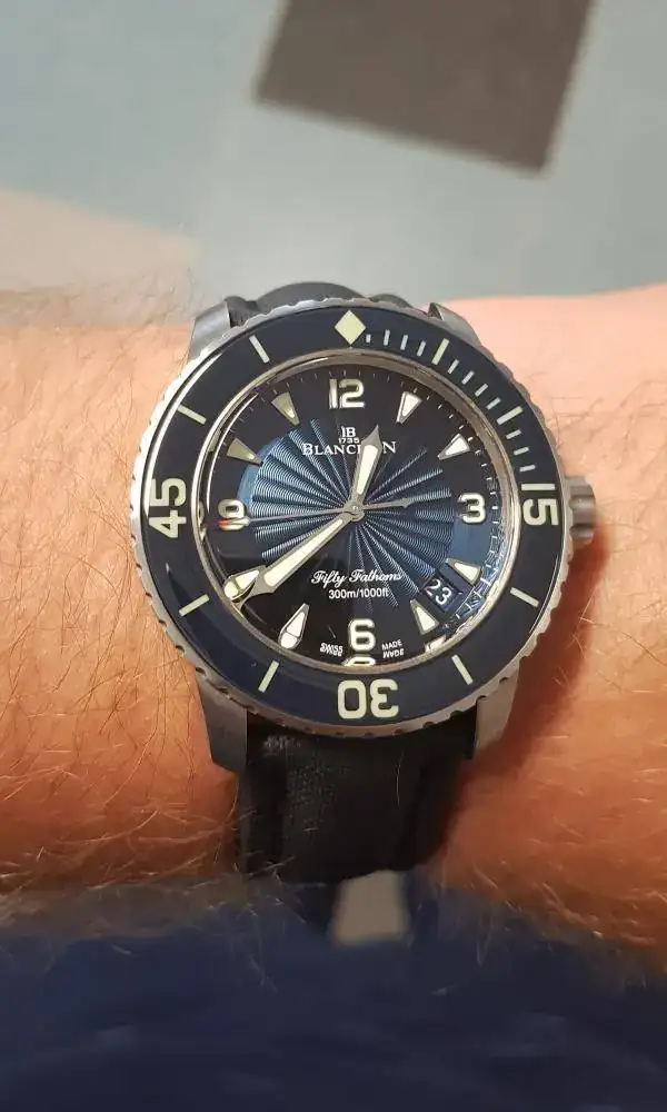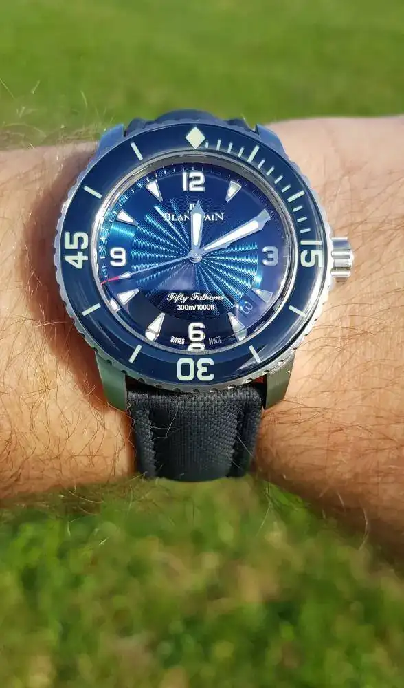 Que decir del Fifty Fathoms que no se sepa? Para mi es el diver más bonito jamás diseñado, sencillamente precioso y perfecto, desde los indices, al bisel, pasando por a las agujas. A la luz de sol tiene tantos matices que podrías estar mirándolo cada momento y verlo cambiar a cada momento.