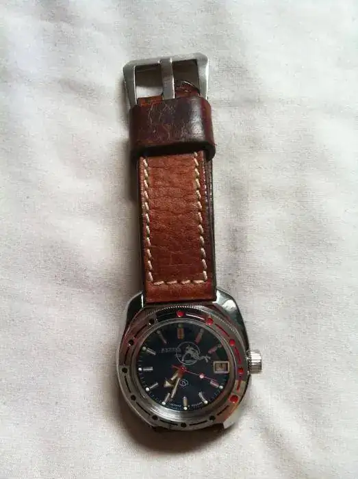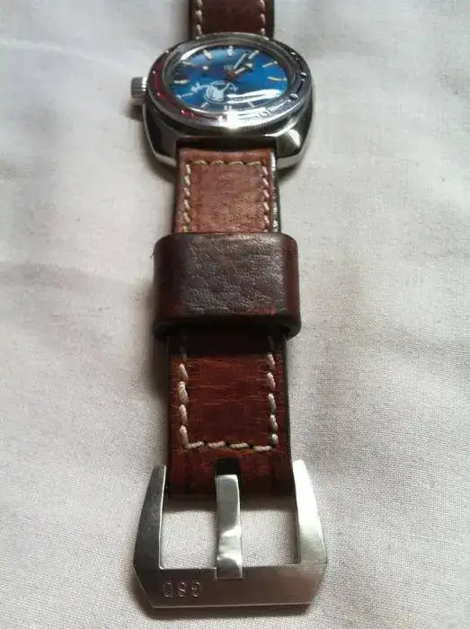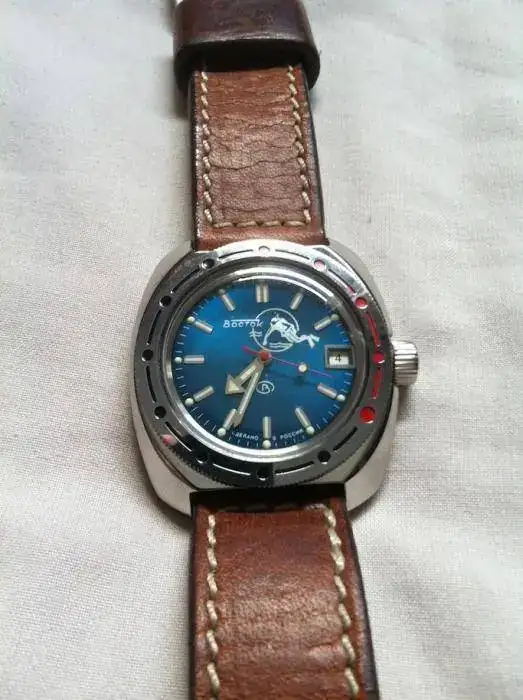 Saco a la venta un clásico diver: Vostock Amphian en color azul, con papeles y garantía de fecha 4/10/11 acompañado de una magnífica correa de piel marrón Greg Stevens de precio considerable.