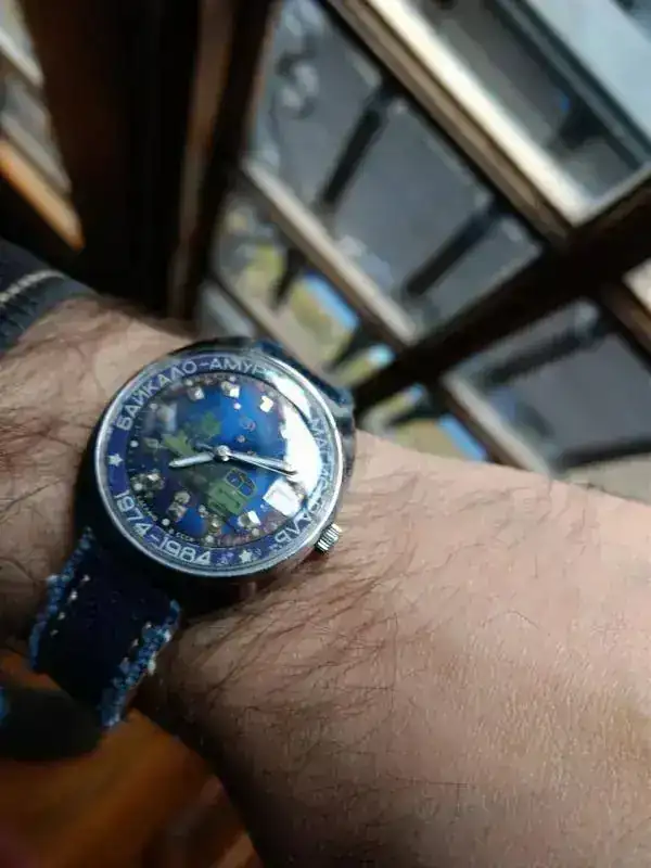 La luz, al igual que en un Luch de 23 rubíes, es muy importante en este modelo. Cómo muy bien ha señalado el forero The Skipper, junto al dibujo de un retazo de la taiga siberiana que pasa a estar atravesada por el ferrocarril, y en primer plano la locomotora (metáfora del progreso y del éxito de la obra pública), el dial tiene un fondo azul precioso que es esencial, tanto como el dibujo, y son junto con las letras y las estrellas, lo que singularizan, dentro del mundo de la relojería, este reloj, que fue fabricado en un país que ya no existe.