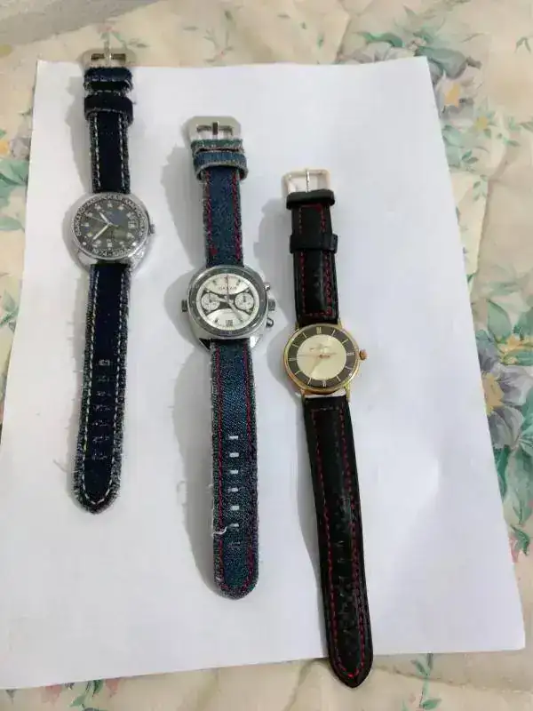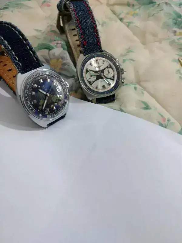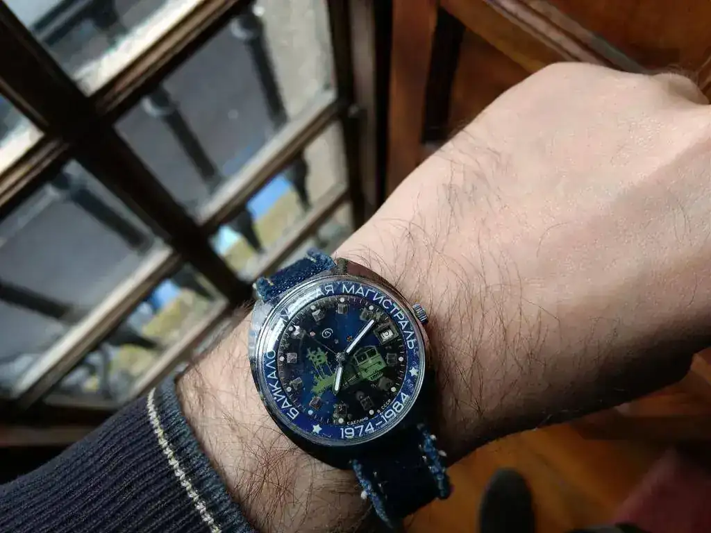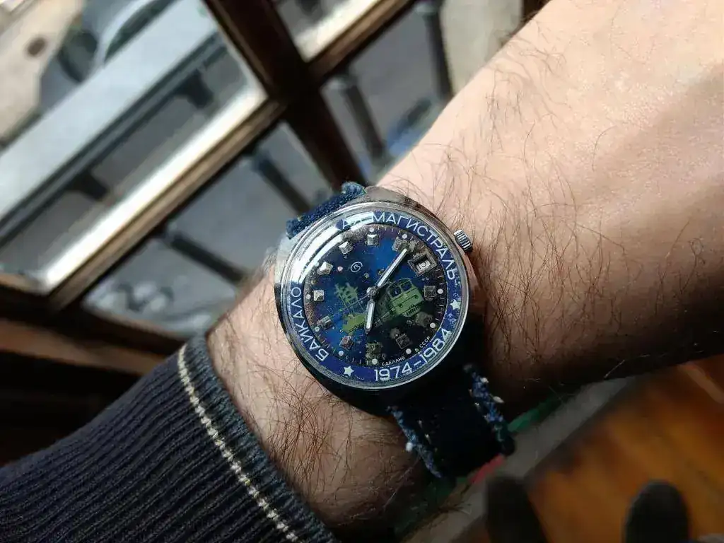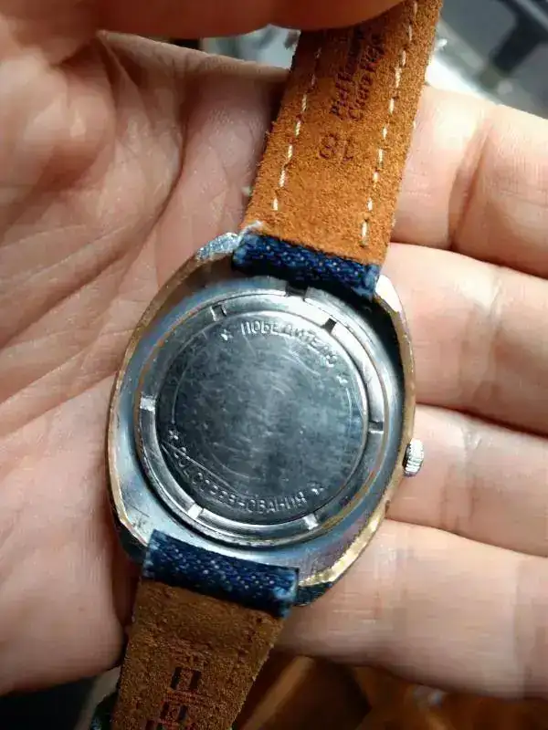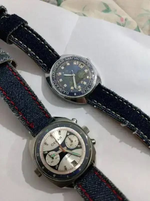 Cuando llegó, por cierto, llegó sin correa, como un típico reloj soviético de aquellos tiempos, y tuve que discurrir qué tipo de correa le podría quedar bien. Al final opté por una correa “vaquera”, un poco con la idea de rejuvenecerlo, de demostrar que hoy en día se puede llevar un reloj como éste sin complejos, y de darle un aire distinto al que tuvo. Supongo que, siendo costumbre separar reloj y correa hasta el momento de la venta, los creadores de su diseño no imaginaron una solución como ésta, sin duda “popular”. Nunca he visto que se hubiese empleado una correa de reloj vaquera en tiempos soviéticos. Espero haber acertado. La solución elegida es la misma que le di al Okeah.