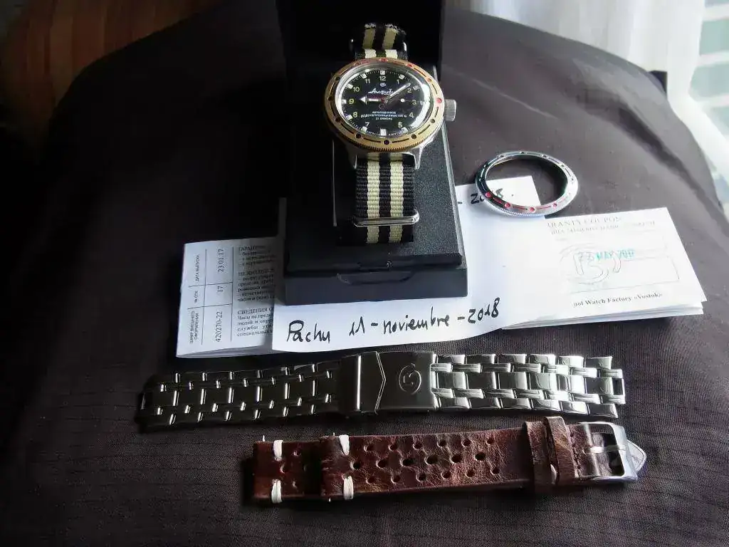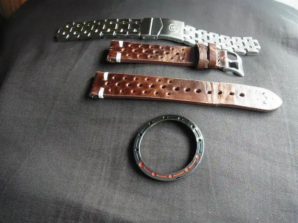 -- Extras incluídos:bisel bronce de buceo original de la marca,valorado en 9 euros correa nato a juego,negro/bronce y correa rally marrón valoradas en 34 euros.Se incluyen,por supuesto,el armis y el bisel originales,de acero pulido y sin estrenar.