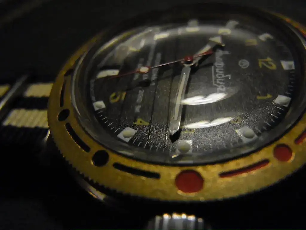 -- En buen estado de funcionamiento y estético:sólo alguna pequeña raya superficial(ver fotos macro,a la una y las nueve )que no compromete la estanqueidad ni afecta a la legibilidad.No las quité porque se me terminó el Polywatch.