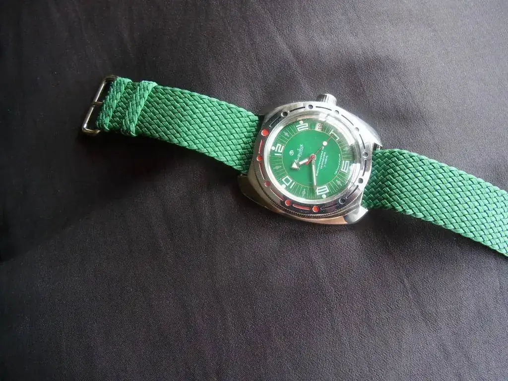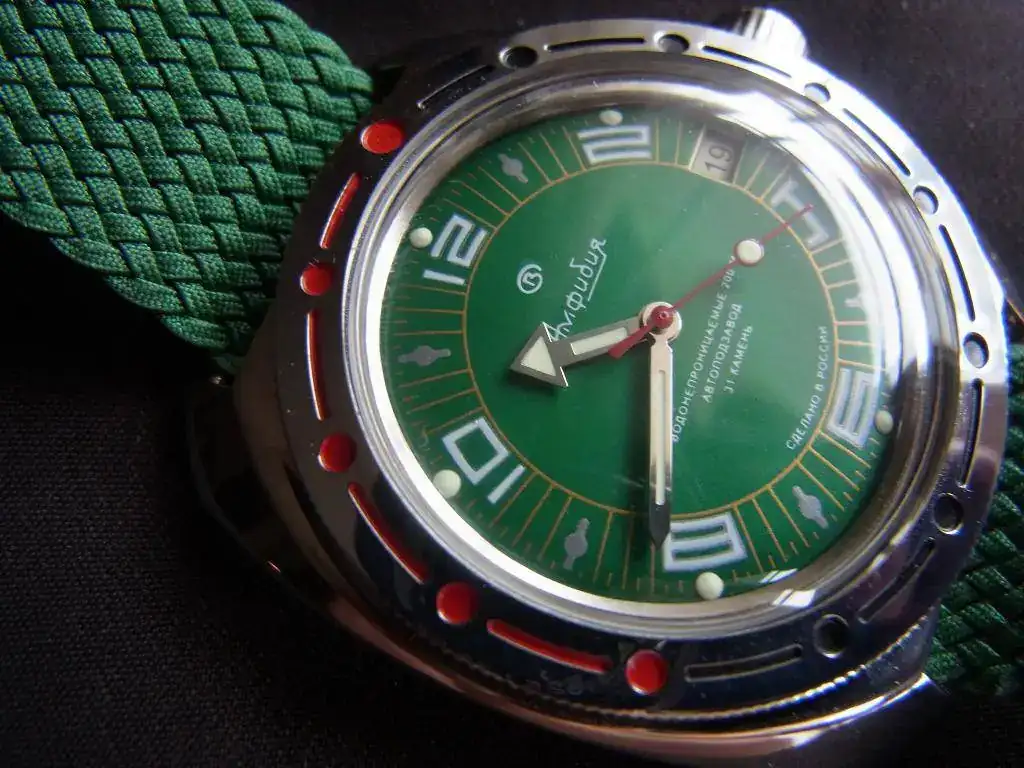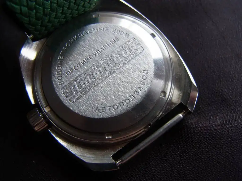 --Esfera verde con números blancos en curiosa y original disposición circular.Círculo interior e índices minuteros amarillos.Agujas:típica flecha Amphibia,con pintura luminiscente.