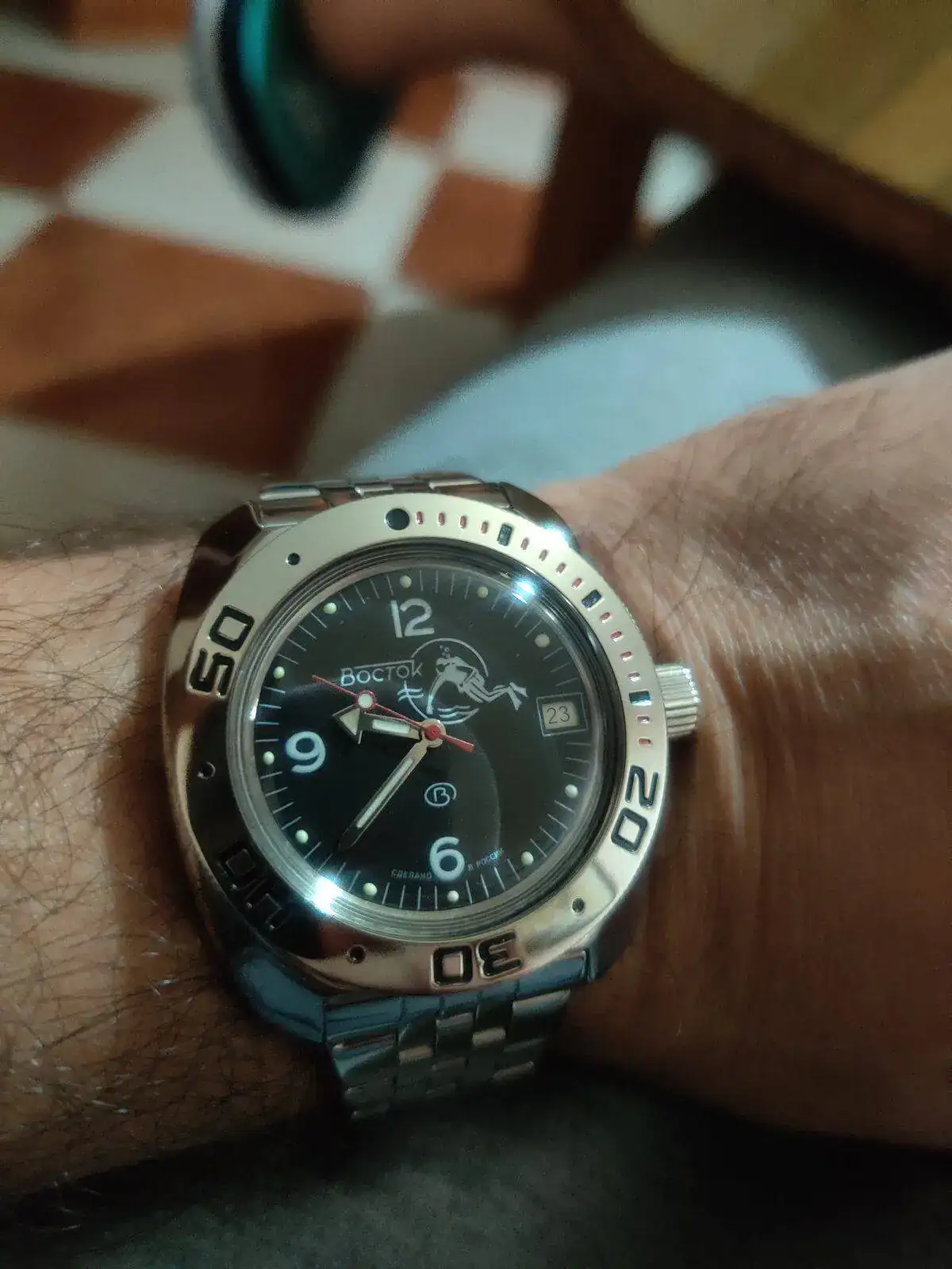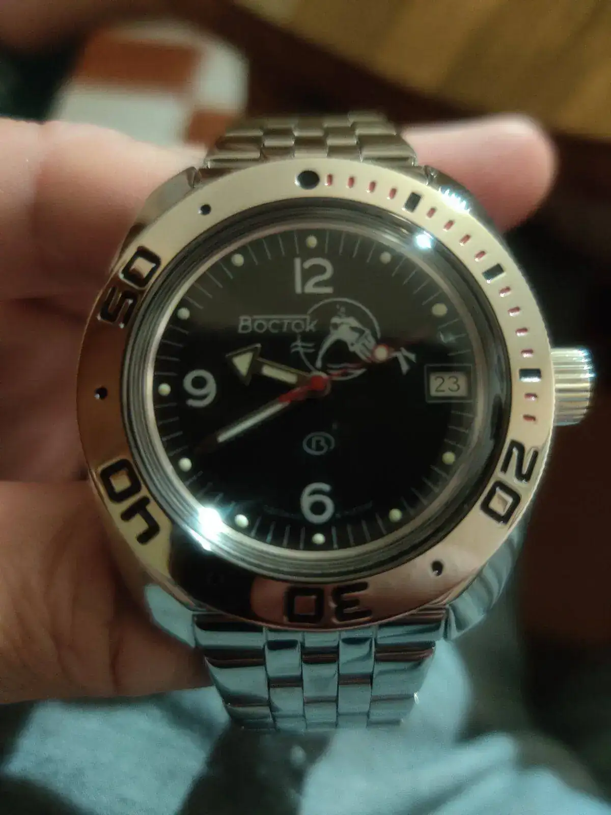 Prácticamente recién llegado, andaba tiempo con ganas de tener uno, por 60 euros no está mal, llegó en poco más de un mes de Rusia y no ha pagado aduanas, lo compre a través de una tienda de eBay no de Meranom, ahora el brazalete malo malísimo, y el funcionamiento de la corona es particular, incluso con sus "truquitos" para darle cuerda, me gusta, es un reloj con carácter, si fuera cepillado sería aún mejor. Dentro de las muchas opciones de dial me decante por este tipo "Explorer" por clásico y legible, de aspecto más militar.