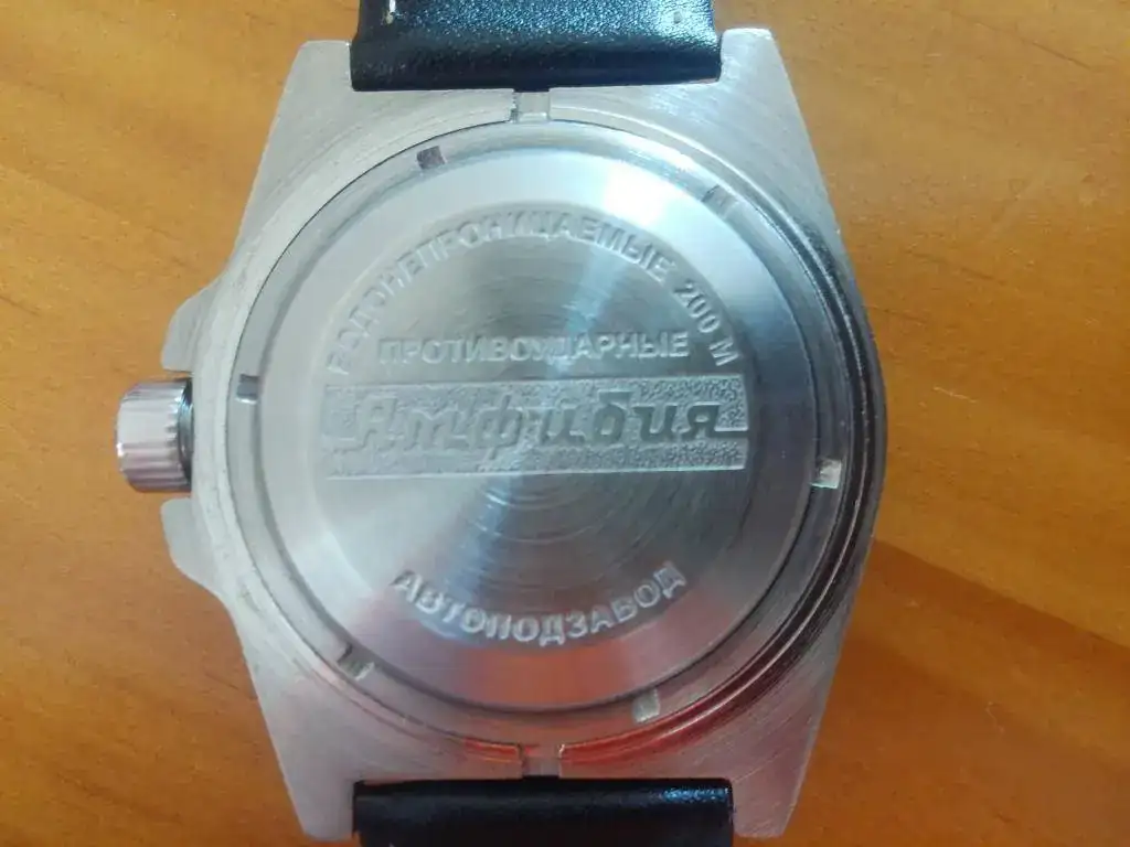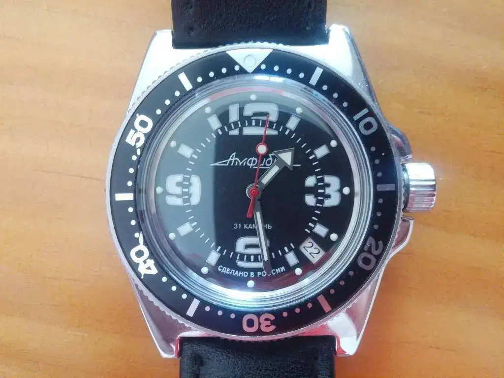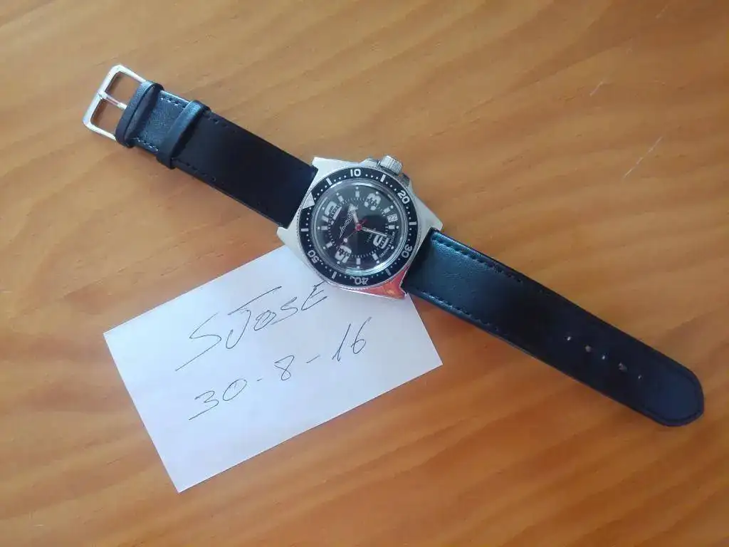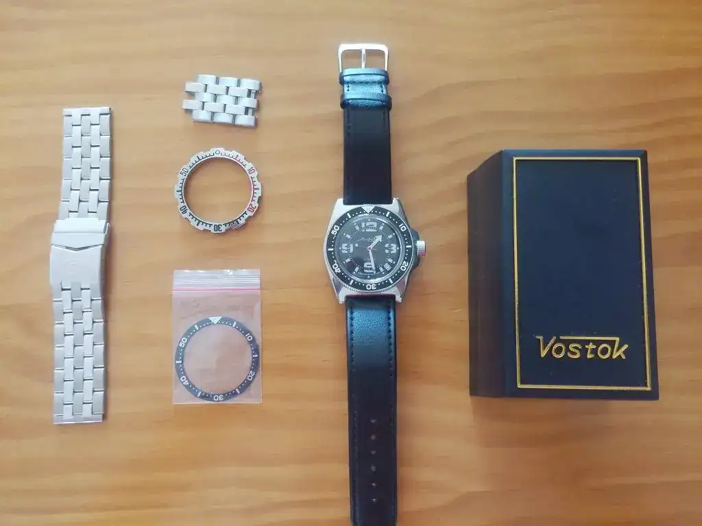 Vendo Vostock Amphibian Caja 110 personalizado con correa de piel negra y bisel Seiko.