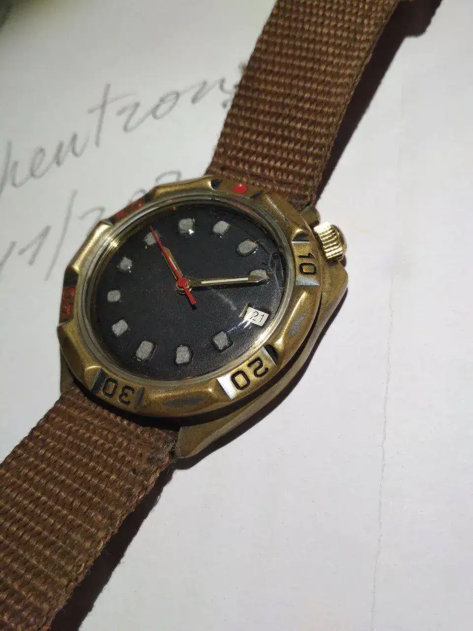 Por no usarlo, pongo a la venta este komandirskie. Ha sido envejecido artificialmente para mostrar el laton de su caja en crudo y trabajado a lima su caja para eliminarle sus cuernos originales. El dial purpurina original ha sido pintado de negro. Sus indices recubiertos de material luminiscente no son un ejemplo de profesionalidad pero creo que en esta personalizacion no desmerece, manecillas son las originales. Cuando lo compré el fabricante ponia que la estanqueidad es de 50m, pero ahora pone 30 metros. Yo lo he probado y no le entra agua. El plexi tiene una pequeña aberracion optica a las 2. El movimiento esta bastante ajustado, sino recuerdo mal andaba sobre +5 s/dia