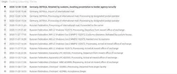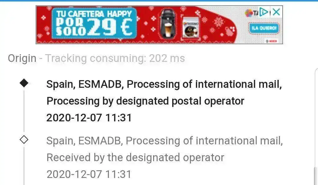 Creo que mientras pone ESMADB (España/Madrid/Barajas) aún lo tiene Aduanas. Vamos que está en tierra pero técnicamente no ha entrado y por eso si miras el seguimiento de Correos verás que aún pondrá "en camino", si pone "Clasificado" significa que ya ha pasado a manos de Correos.