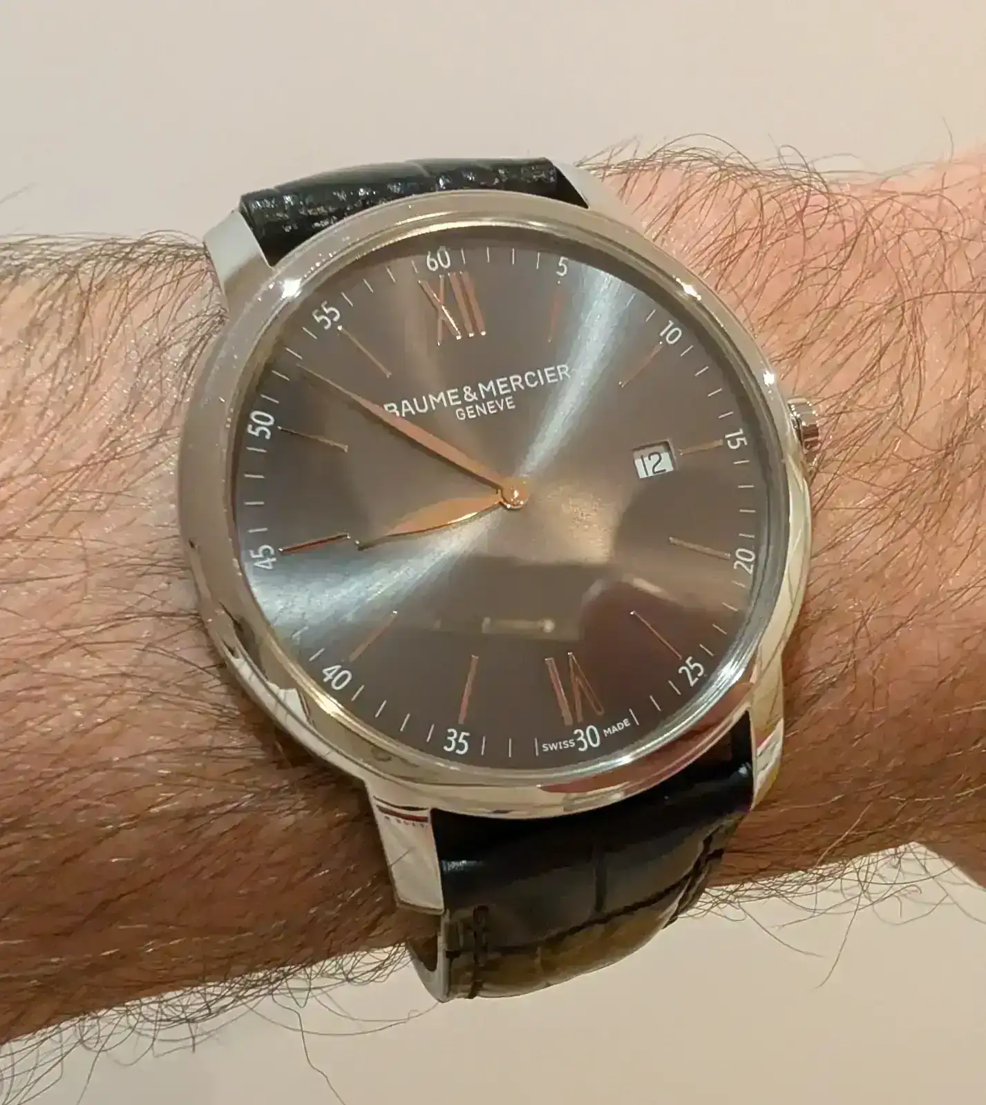 Así que buscó uno mas de vestir, y se decidió por este Baume et Mercier Classima, que pese a ser de 42mm, su altura de apenas 6mm, ventajas del cuarzo, quedaba muy elegante.