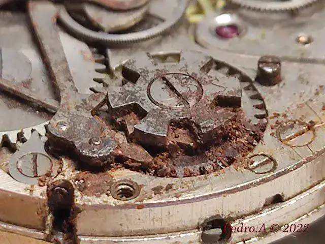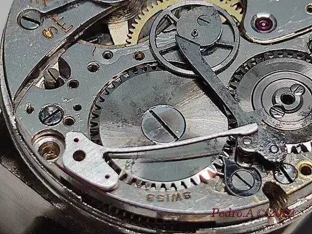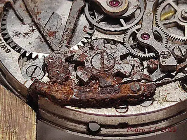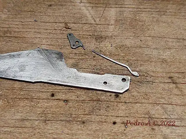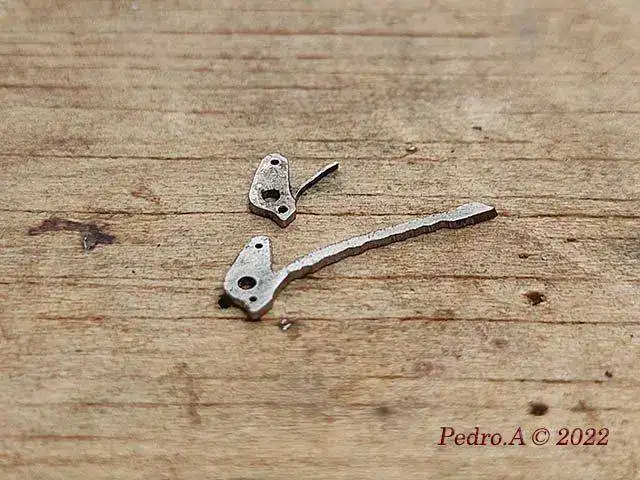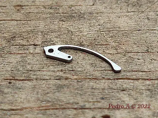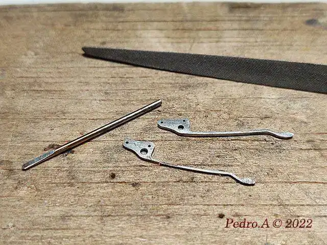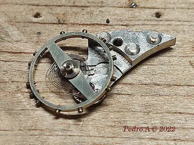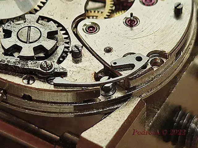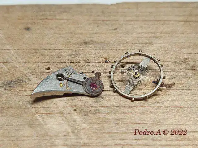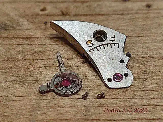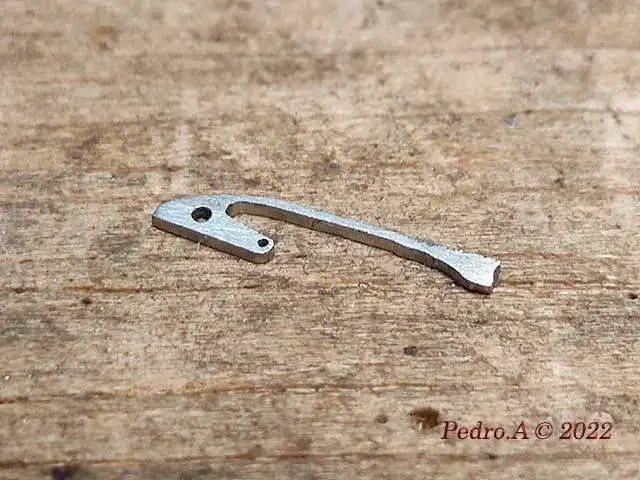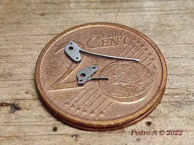 Y hasta aquí la parte fácil que se hace siempre, cambio de eje, enderezar espiral, óxido, limpieza...... Pero esto es un crono, y me he encontrado con que está a falta de piezas que son las que le permiten funcionar, en este caso los muelles planos que actuan sobre palancas y rueda de pilares.