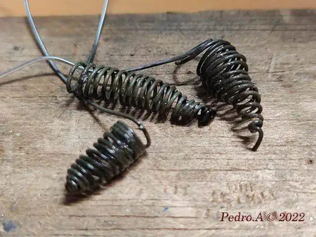 Hechos los muelles viene el momento del templado, otra de las tareas complicadas. Después de consultar nuevamente me dijeron que el mejor método era enrollar la pieza en hilo de metal y rellenarlo con jabón líquido natural antes de ponerla al rojo y sumergirla en aceite motor.
