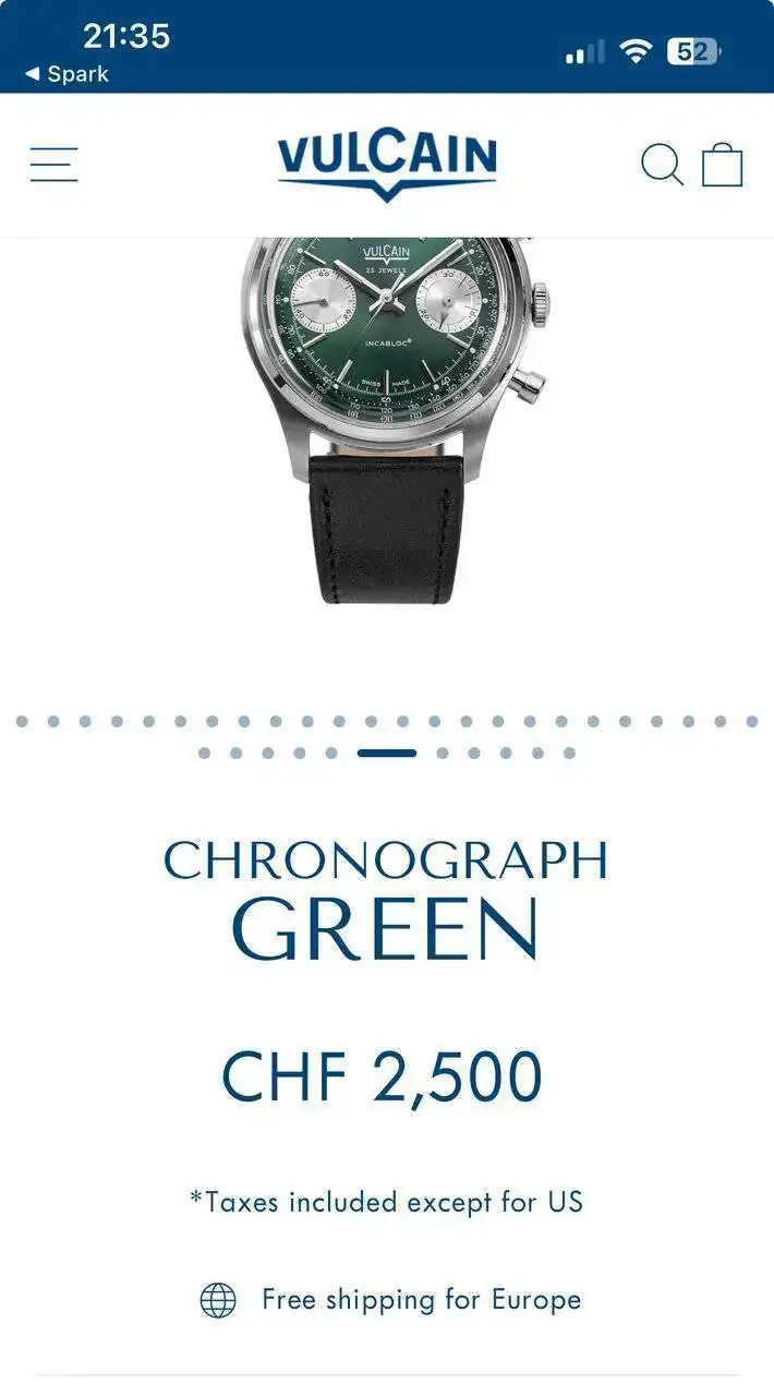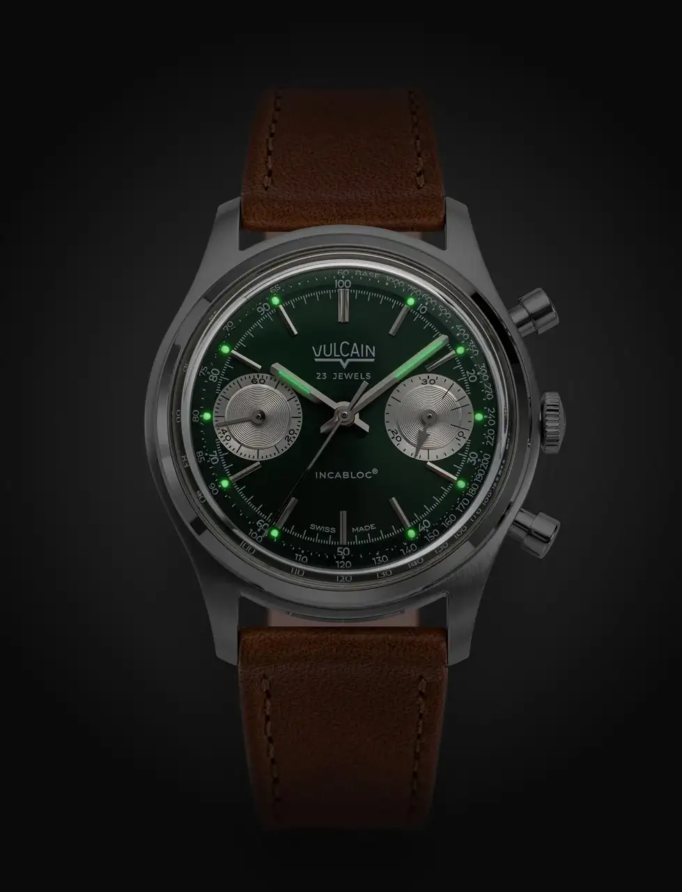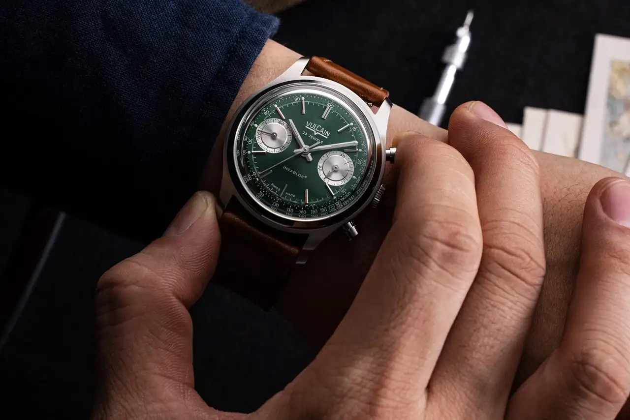 Gracias por traer.Que parece que todo el mundo tenga que tener su verde. Vulcain, haciendo honor a la sensibilidad que ha venido mostrando por los códigos de la relojería clásica, presenta su cronógrafo de 38 mm en "Racing Green". Tal vez si lo hubieran hecho de carga manual hubieran ahorrado algunos mm de grosor, aunque parecería que quien se lleva la parte del león ahí es el cristal abombado y su bisel