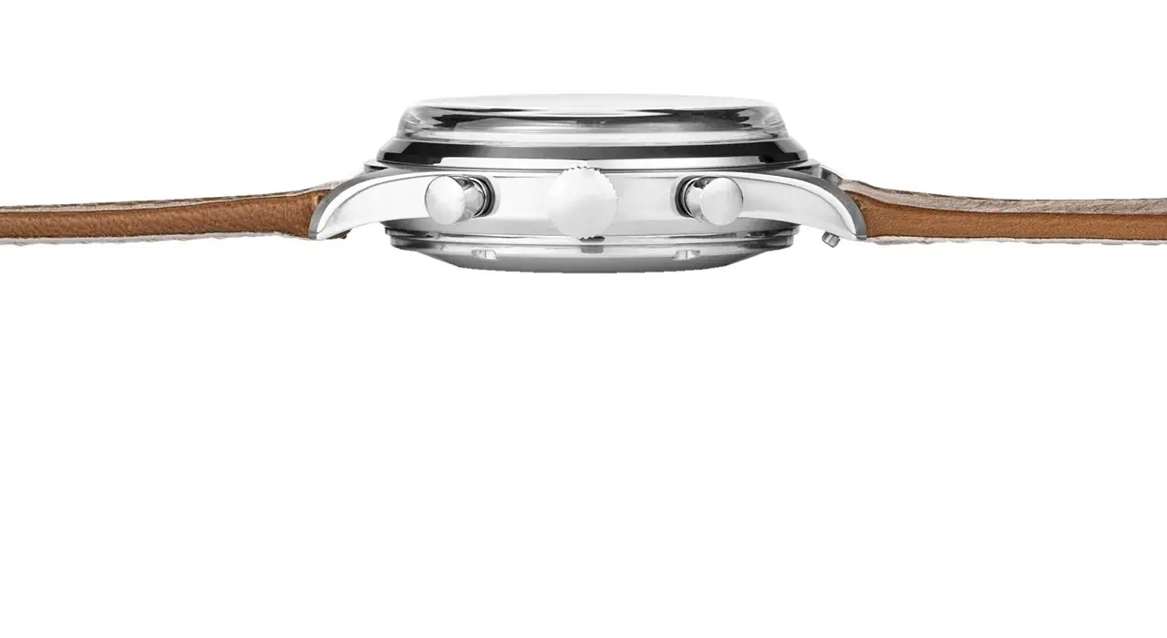 Un reloj parecido, de cuerda manual tambien, llega a 13,9 mm, 1,5 mm mas. Algo mas complicado por los pulsadores rectangulares y tiene 39 mm.