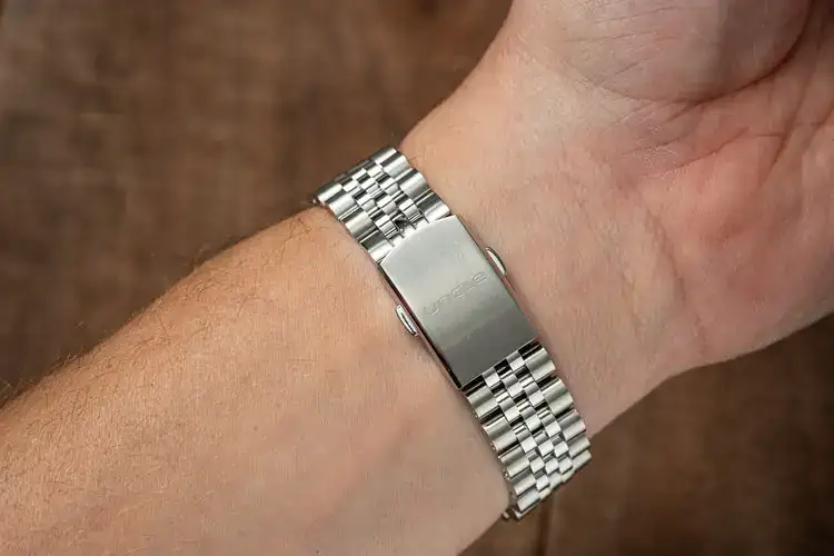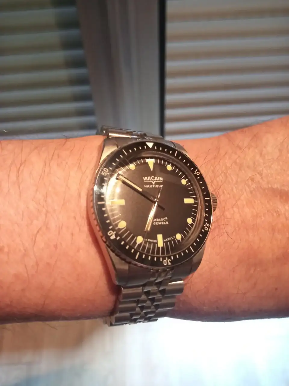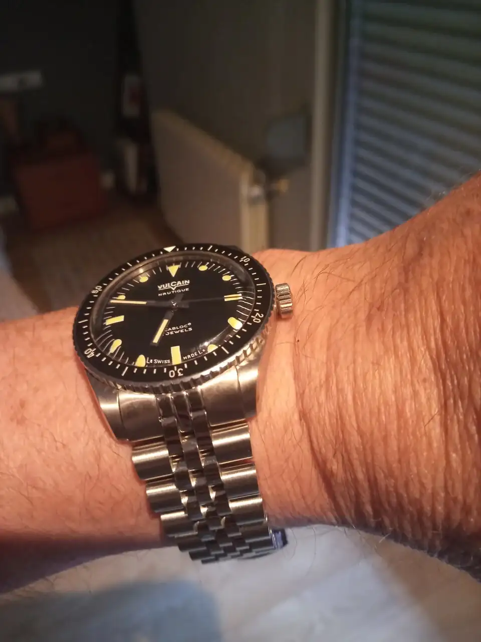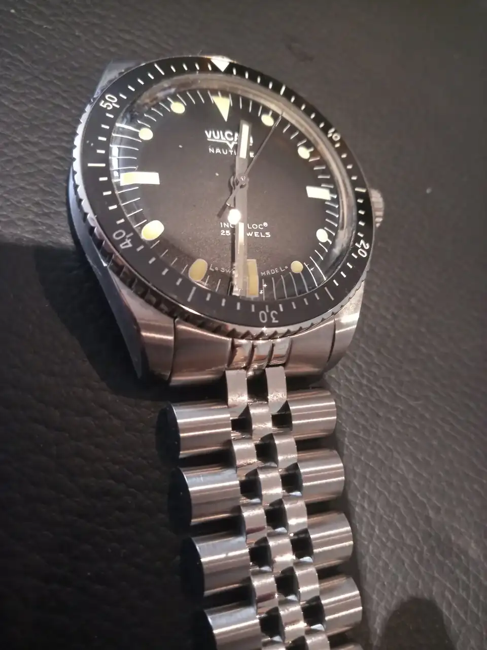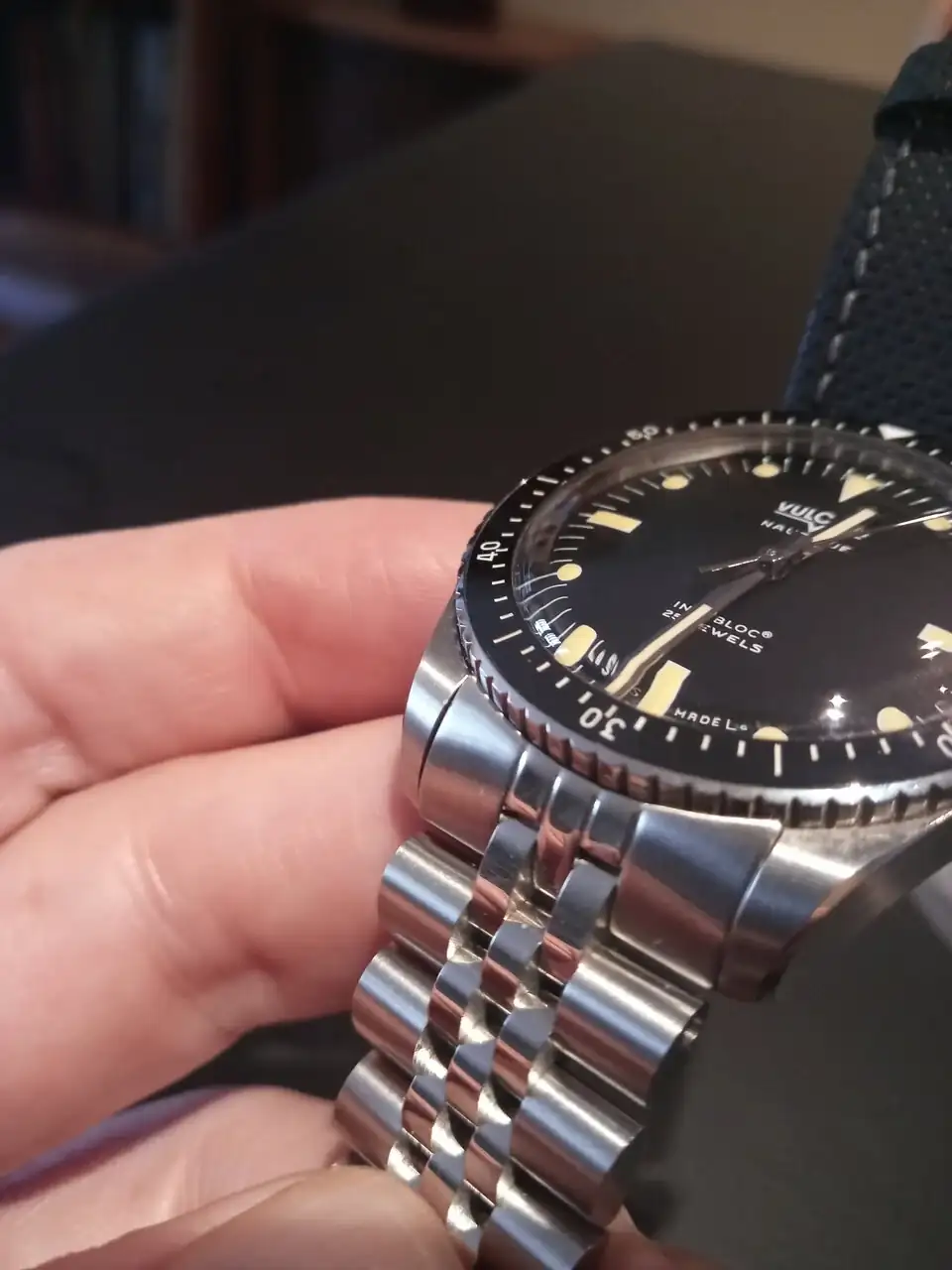 Abro un hilo para confirmar que el brazalete Uncle para el Hamilton Murph 38mm encaja a la perfección en el Vulcain Skindiver. Yo he escojido el jubilee pero el modelo oyster (ahora mismo fuera de stock en Uncle) al tener los mismos eslabones finales tiene que encajar igual de bien. Una opción más para este estupendo vintage diver. El brazalete encaja a la perfección y no tiene ninguna holgura. El bisel puede accionarse con toda normalidad. Esta tarde iré a.mi relojero a que me quite algún eslabón (van con tornillos muy pequeños). El cierre lleva tres agujeros para microajuste, no es la leche pero al ser los eslabones bastante pequeños se puede conseguir un buen ajuste. El precio incluyendo aduanas e IVA 131 eur. Y ahora unas cutre fotos