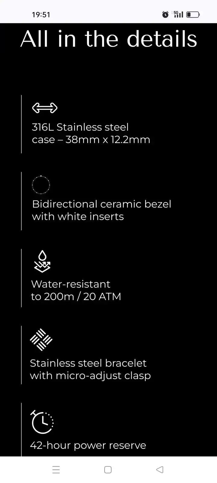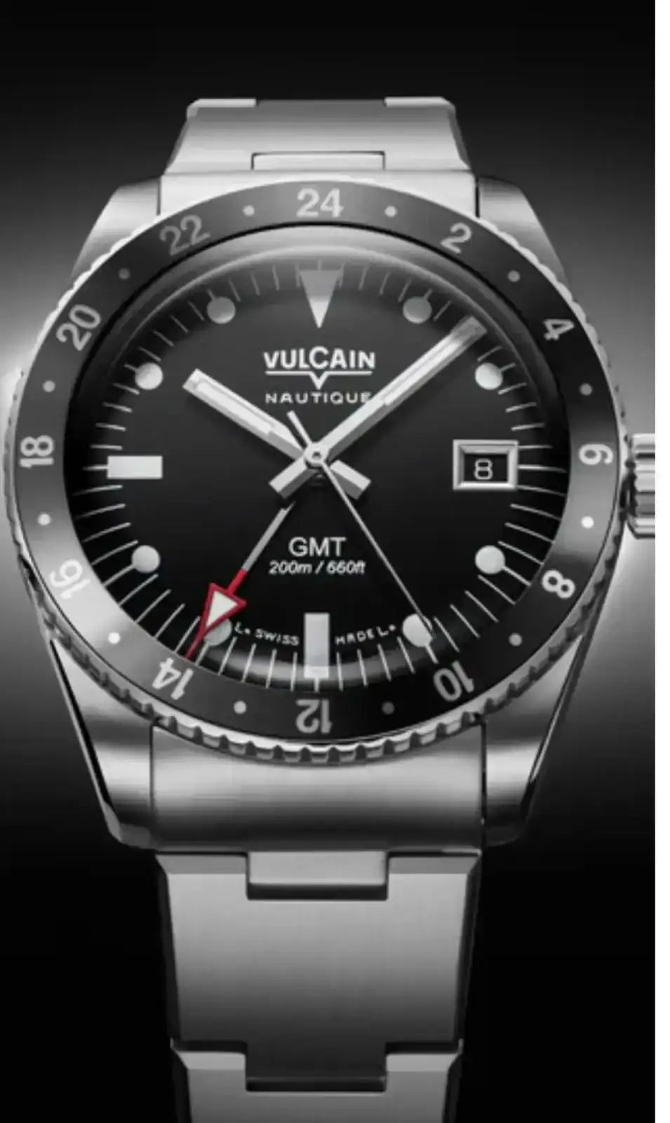Tiene buena pinta: 38mm y muy plano para ser un GMT. En las fotos aparece el negro con índices blancos y anuncian otro negro con índices tostados (imitando el color del tritio).