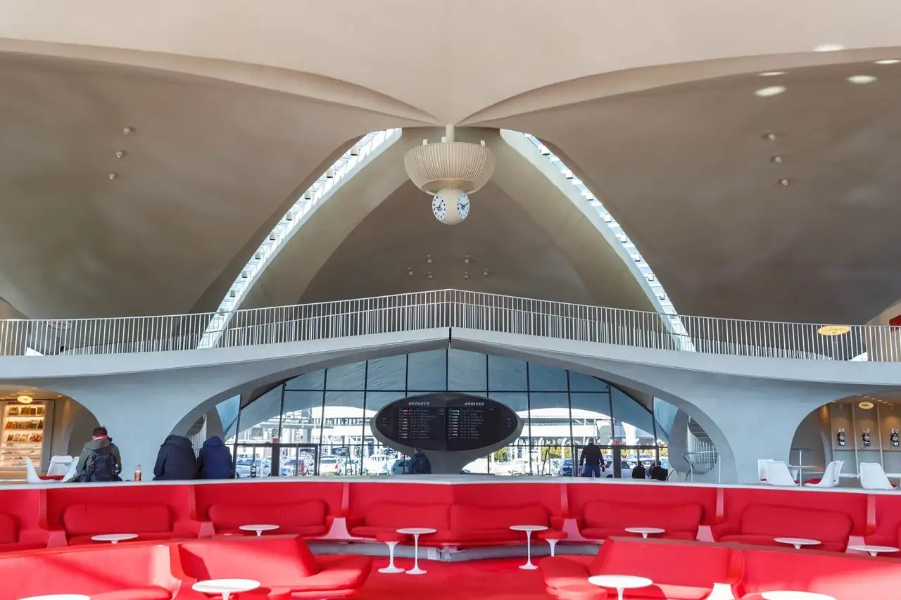 Al entrar en esta catedral del transporte aéreo, llama inmediatamente la atención el magnífico mostrador de facturación del TWA Hotel, con un tablero de salidas y llegadas de estilo retro que, a pesar de su aspecto nostálgico, ofrece información actualizada sobre los vuelos. El personal, ataviado con trajes de época, completa la experiencia.