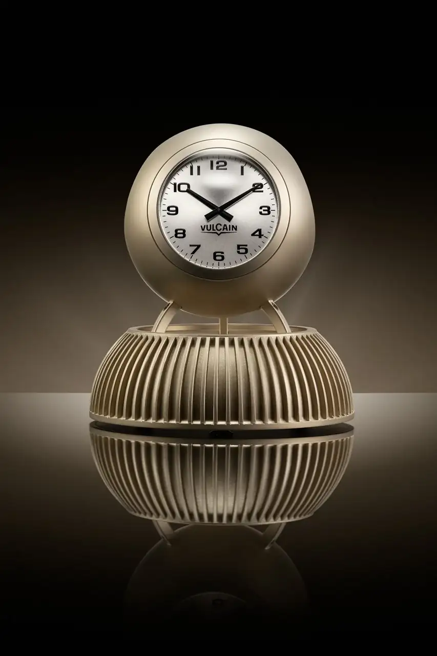 A diferencia del reloj suspendido original, con sus tres esferas orientadas hacia fuera, esta versión de sobremesa alinea sus esferas en sentido contrario. Cada esfera, de color gris claro soleado, está marcada por índices, agujas y el logotipo de Vulcain en negro, lo que garantiza una legibilidad óptima. Con tres movimientos independientes (de cuarzo RONDA 712), las tres esferas pueden mostrar diferentes husos horarios.