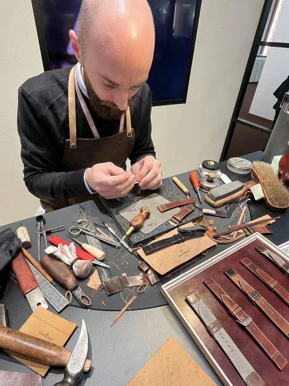 Y otra, con el artesano de Casa Fagliano trabajando en una correa.