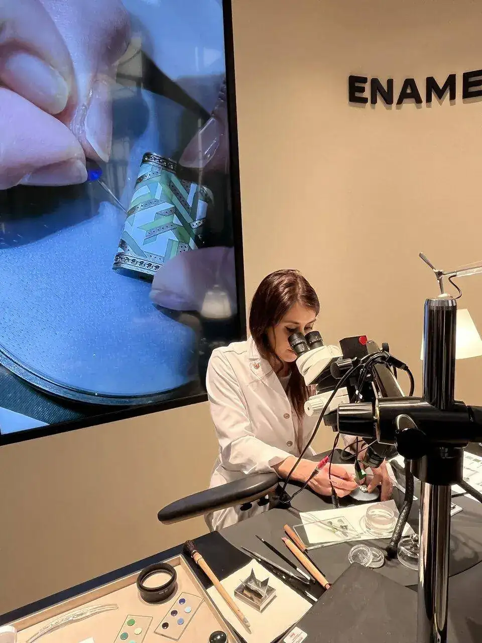 El Stand también contaba con dos áreas súper interesantes , con artesanos trabajando en directo,dedicadas al proceso de grabado y esmalte del lado de la caja destinado a ello.