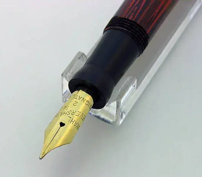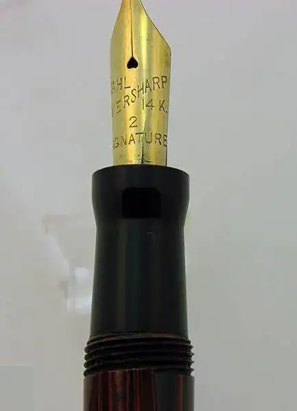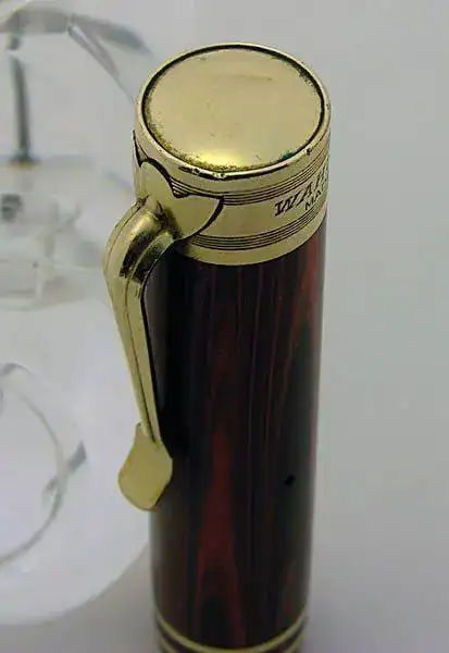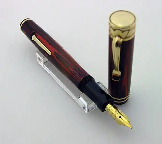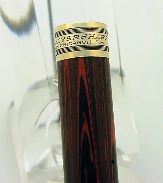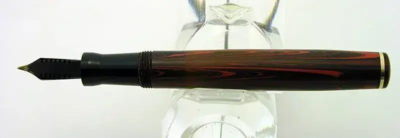 Ofrezco para su venta esta estilográfica WAHL EVERSHARP en ebonita negra y roja con chapados en oro estilo Art Decó, de tamaño pequeño-mediano, con DEFECTO en Plumín.