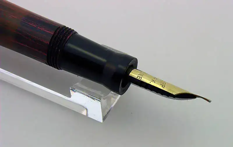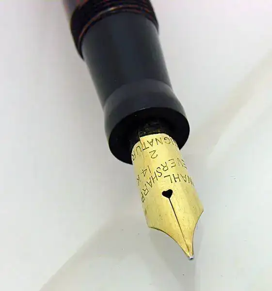 La pluma tiene un plumín de trazo probablemente Medio, suave y con alimentador de ebonita. El DEFECTO se encuentra en el plumín, el cual presenta una raja en la parte posterior, que si bien no impide su utilización ni afecta a la escritura normal, es un daño destacable que debe tenerse en cuenta si se desea utilizar la pluma de forma habitual. Las fotos reflejan el defecto.