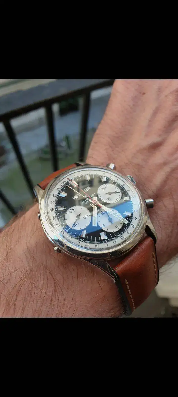 Se trata de un Wakmann panda invertido con la famosa máquina Valjoux 72C. Un calibre de cuerda exactamente igual que el que monta el famoso Rolex 6036, y otros grandes que en su versión más sencilla Valjoux72 montan los Heuer Carrera y el mítico Rolex Daytona Paul Newman.