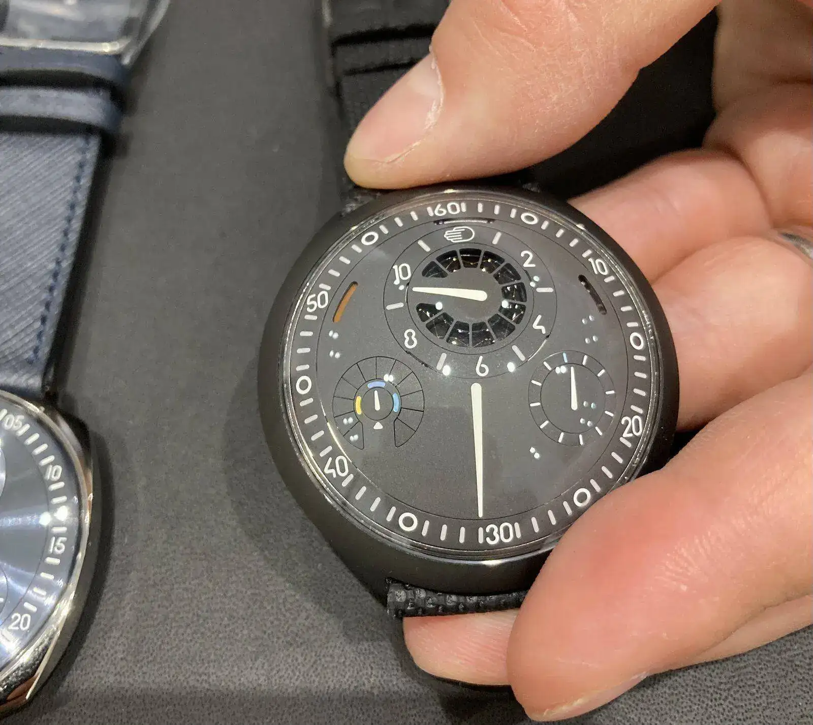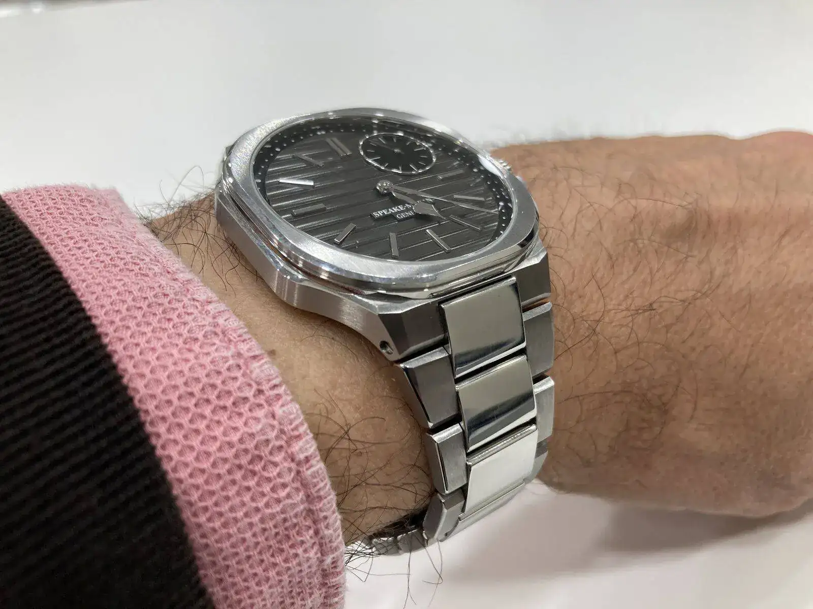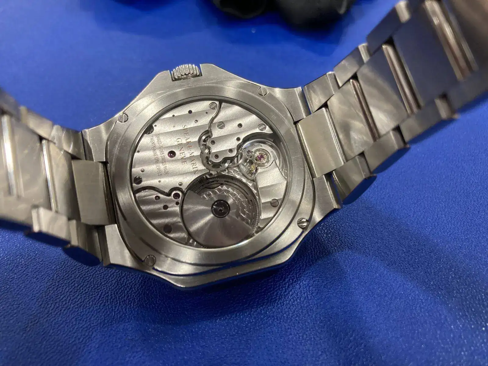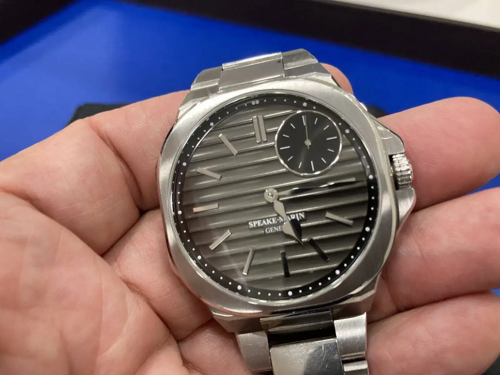 Y llegamos a uno que no me ha sorprendido. Cuando vi, y compartí aquí, la nota de prensa, todos pensamos lo mismo: cómo se parece a un recientemente descatalogado Nautilus. Algunos dijeron que sí, que vale, que se parecía; pero que tenía su propia imagen y que valía la pena mirarlo dos (o tres) veces. A mí se me ha confirmado todo lo que temía: lo recuerda tanto que no puedes mirarlo sin pensar que es un Nautilus en feo. Empezando por las bandas (o “ripples”, que es como las llaman ellos, y también llaman al reloj) y el cartucho con el nombre puesto. En realidad el parecido -para mal- termina ahí, porque la caja misma es un despropósito de proporciones, y lo acabados… el otro asistente a la presentación ha preguntado si eso era un prototipo, en fin. Los índices y agujas pulidos a espejo no ayudan nada a la visibilidad. Calibre in-house, eso sí, pero podrían haber acabado un poco mejor el rotor. Un precio de casi 20.000 CHF no creo que le ayude mucho aunque vayan a producir unos pocos al año.