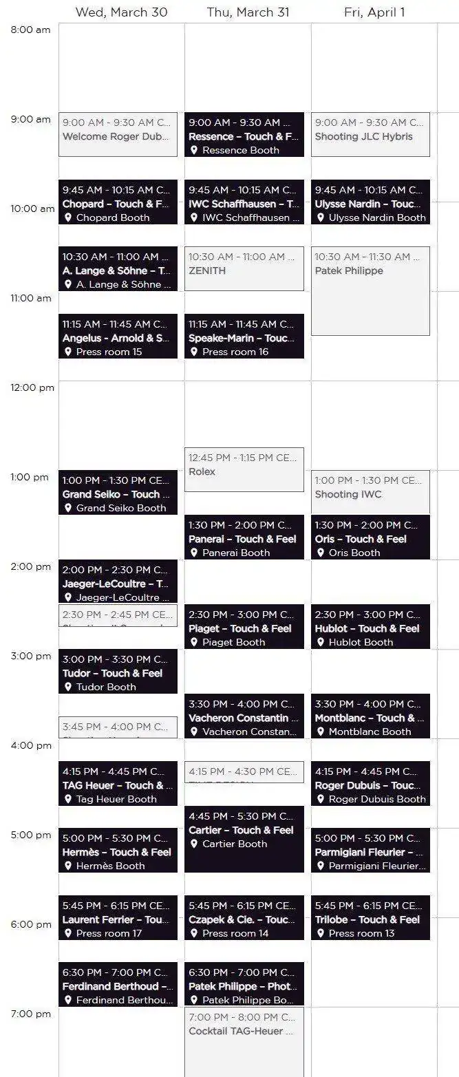 Time to Watches, que albergará marcas "menores" pero no por ello menos interesantes: Sinn, Louis Erard, Reservoir, Frederic Jouvenot... También las independientes más lujosas, como HYT o De Bethune han alquilado suites o salas de hoteles como el Beau Rivage o el Kempinski. En la edición de 2019 (último SIHH) los señores del grupo LVMH (TAG, Zenith, etc) fondearon un barco entero en en Quai de Montblanc... Además, siendo Ginebra el cuartel general de una gran cantidad de marcas, muchas de ellas han optado por poner a disposición de los visitantes limusinas privadas para acercarlos a sus instalaciones. Algo que, teniendo ese toque lujoso de las limusinas, es mucho más barato que asistir a una feria suiza, sin duda.