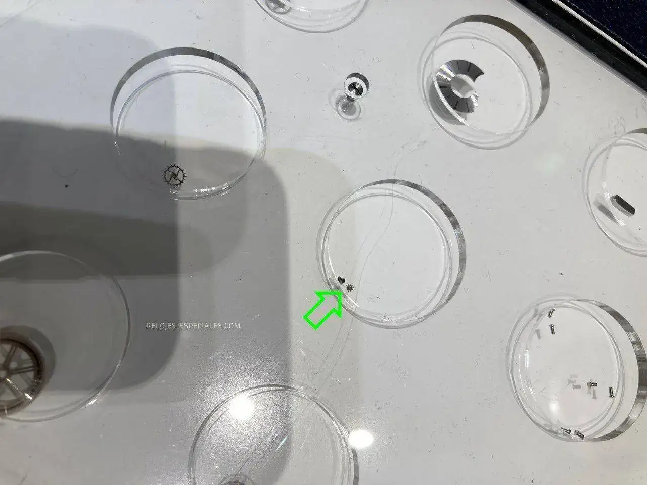 Ah, no podía faltar un tourbillon. Automático y también esqueleteado. En la segunda foto podréis ver el mecanismo de cambio de correa/brazalete. Y el rotor, casi invisible para no entorpecer la transparencia del torbellino.