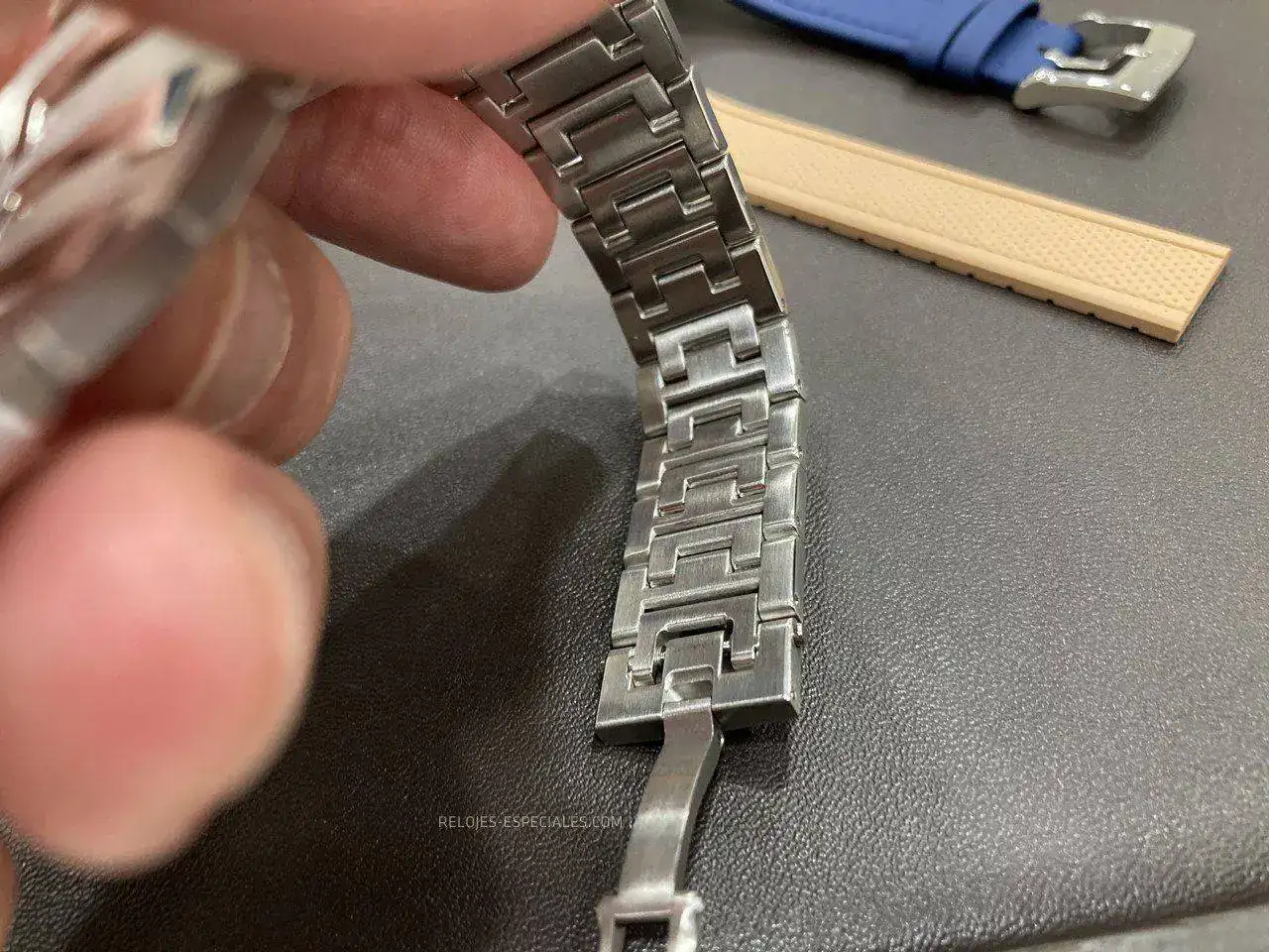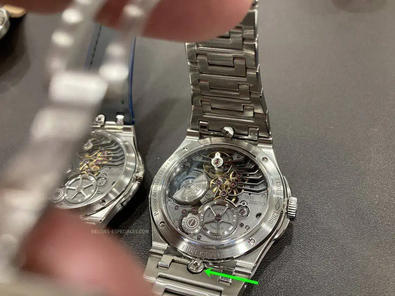 Única pega: este elemento señalado con la flecha permite liberar el brazalete, pero se necesita un instrumento -suministrado con el reloj- para poder accionarlo, lo que le resta agilidad. Claro que, viendo esa máquina, se te quita todo...